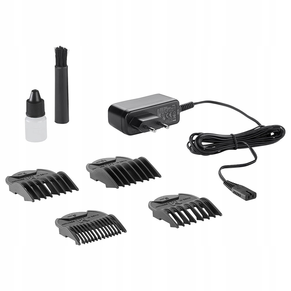 - 2 комплекта батареек XL-Power, 4 насадки-гребешки 3, 6, 9, 12 мм, зарядное устройство и подставка для машинки, щеточка для чистки, масло.