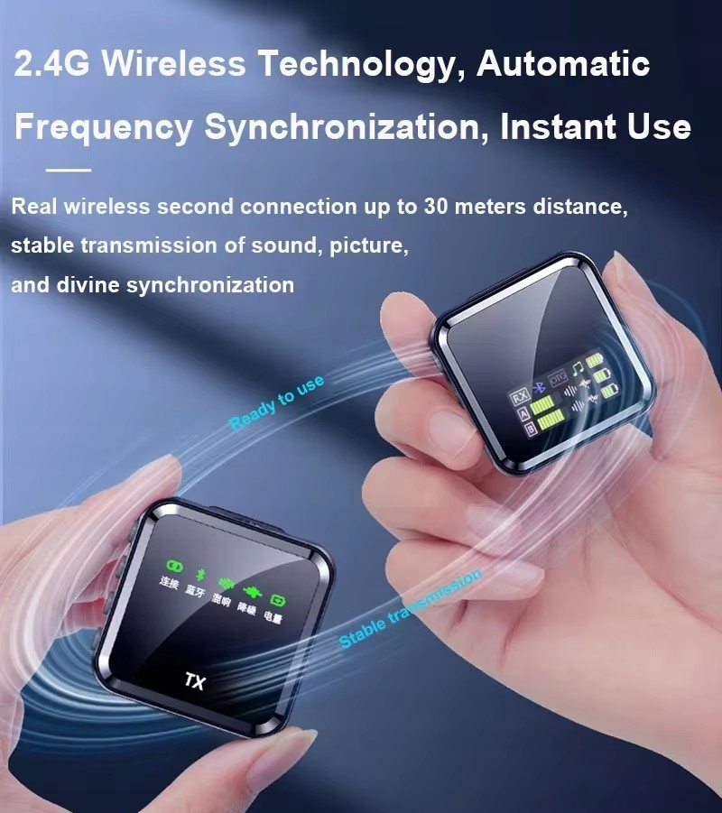 * Беспроводная технология 2.4G, автоматическое испарение частоты и немедленное использование. Практическое беспроводное второе соединение может достигать расстояния 30 м, а стабильная передача аудио и видео синхронизируется. Камеры, мобильные телефоны, камеры, компьютеры, звуковые карты, рекордеры, миксеры и другое оборудование.