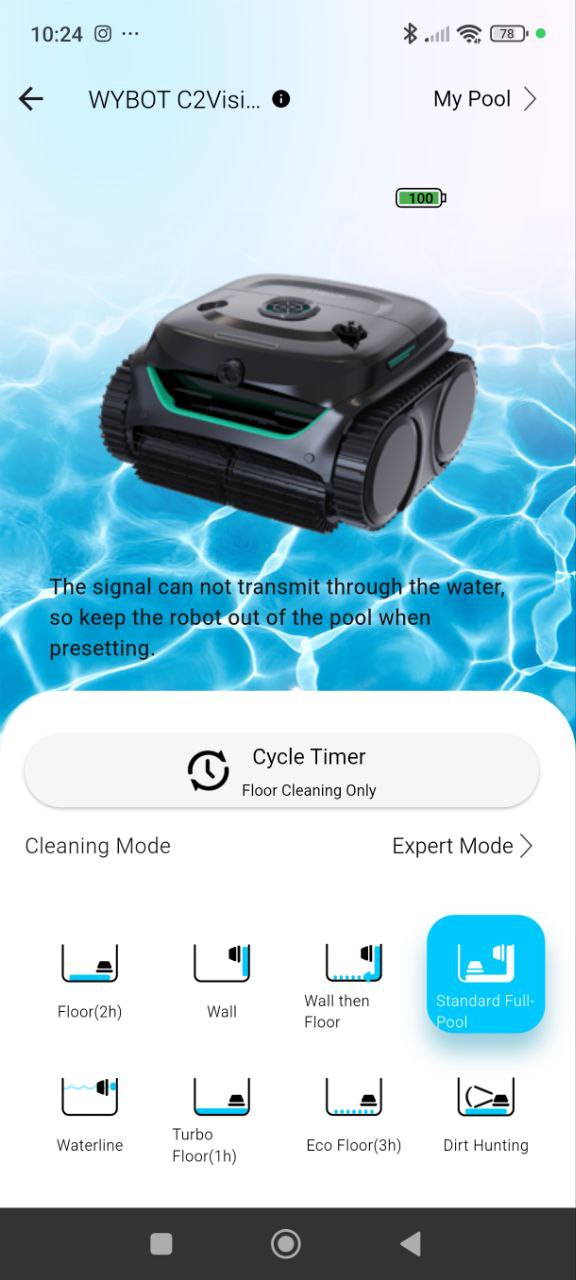 - Очистка с помощью таймера с помощью приложения: благодаря функции таймера в приложении вы можете автоматически очистить бассейн роботом. Выберите один из 5 циклов очистки и наслаждайтесь техническим обслуживанием бассейна.