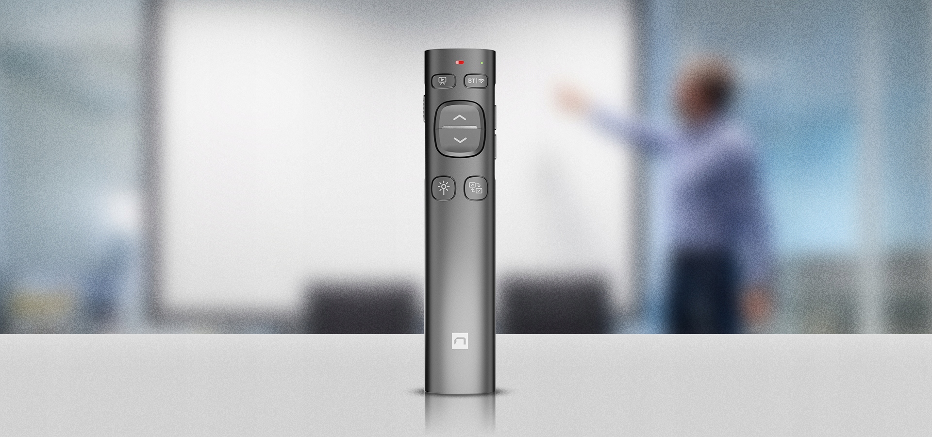 Устройство оснащено восемью кнопками, из которых семь отвечают за определенные функции, а восьмая кнопка отвечает за изменение режимов соединения BT и 2,4 ГГц и в то же время переключение между устройствами. Его работа может быть адаптирована к индивидуальным потребностям в соответствии с инструкциями. Система интуитивно понятных кнопок делает управление презентацией естественным и быстрым, без необходимости отвлечься от аудитории или экрана.
