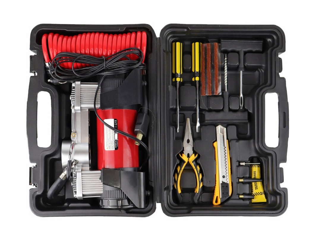 Сильный металлический двухборный компрессор с даткой давления. Компрессор предназначен для перекачки колес, шаров, понтонов, бассейнов и других, благодаря трем различным сосудам в съемочной площадке. Он управляет большими автомобильными колесами 4x4 - внедорожник - фургон - грузовик - кемпинг