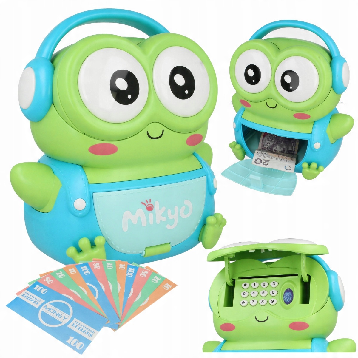 Копилка автоматически принимает бумажные деньги. Просто приложите банкноту к входному отверстию, и лягушка автоматически соберет деньги.