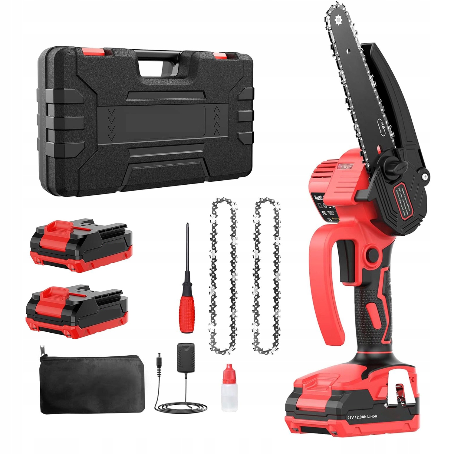 - Усовершенствованная аккумуляторная бензопила оснащена вращающейся на 100° верхней защитной решеткой и защитной решеткой на нижней ручке, кнопкой блокировки и эргономичной резиновой ручкой для обеспечения безопасности пользователя.
