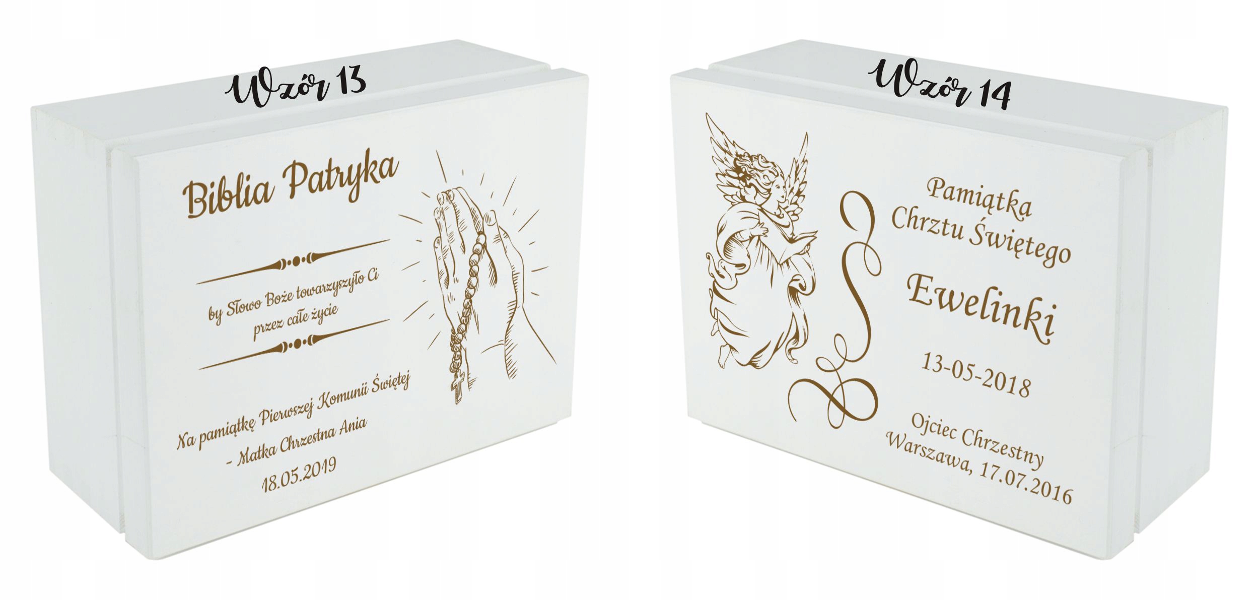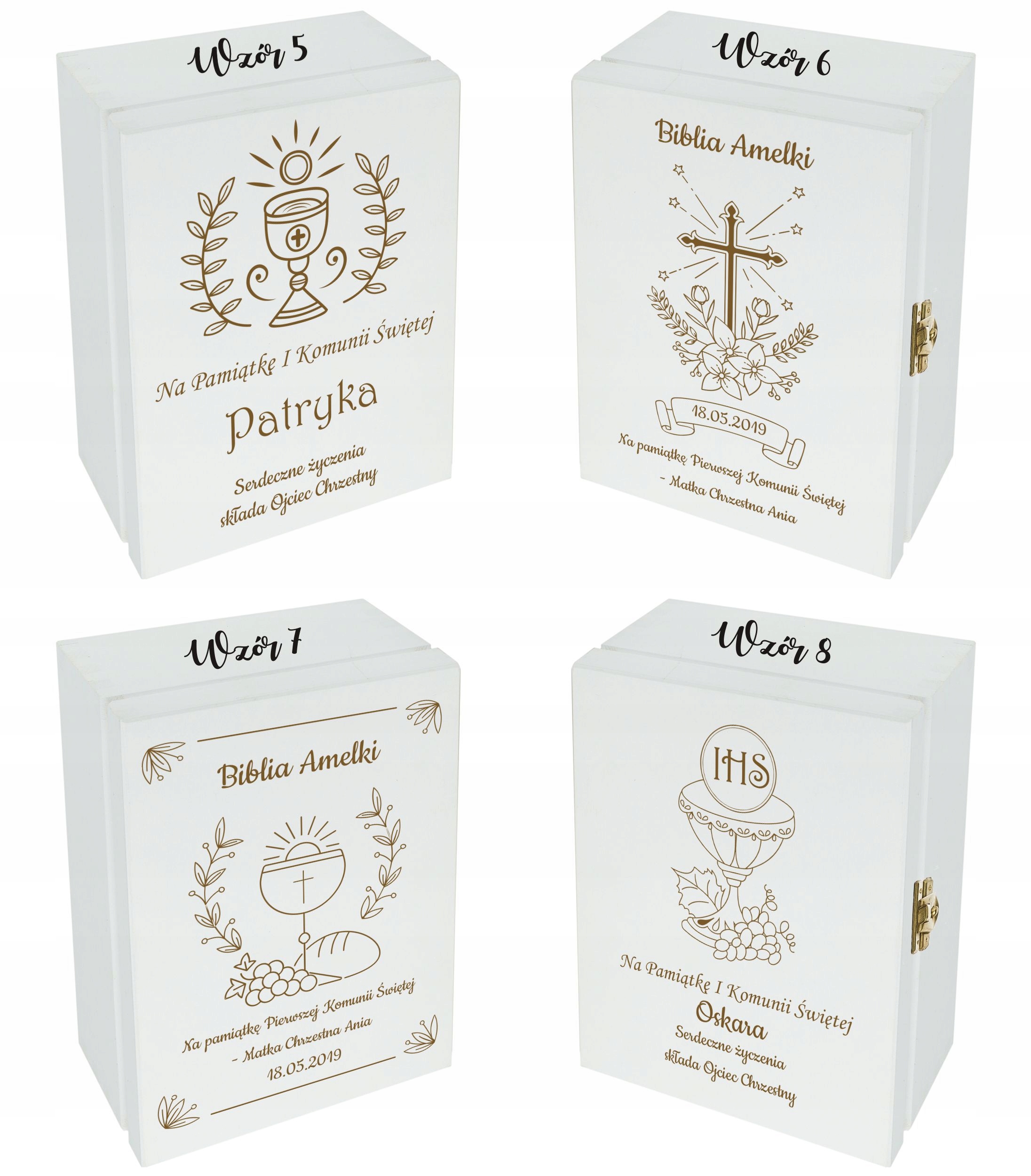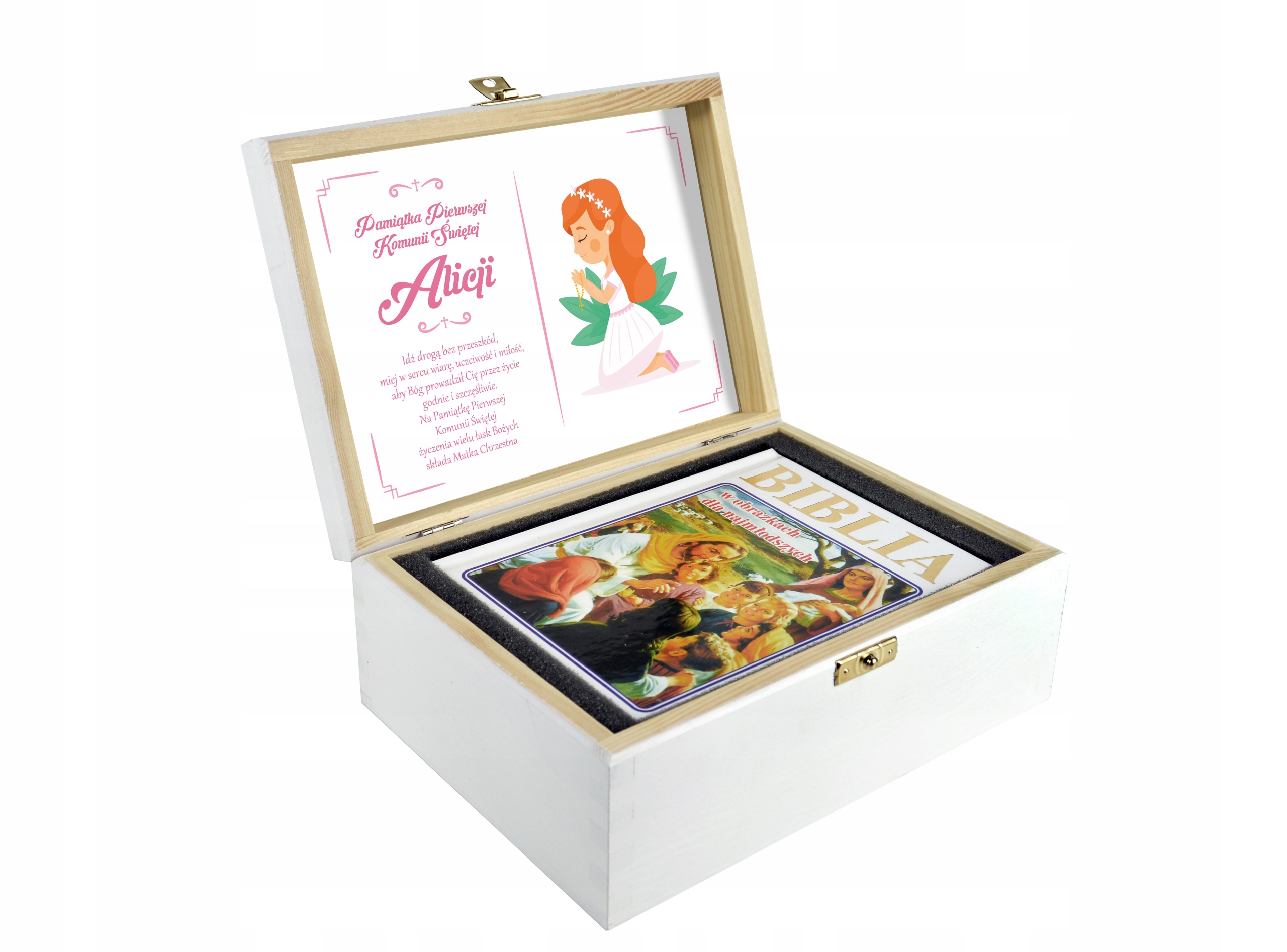 Иллюстрированная детская Библия, помещенная в деревянную коробку, — интересная идея подарка к Первому Святому Причастию или Святому Крещению. Мы можем выгравировать индивидуальное посвящение на крышке коробки на основе представленных ниже рисунков. Внутри коробки, на крышке, находится декоративная тарелка с посвящением, вырезанным по размеру, которое также можно персонализировать. Дополнительным преимуществом представленного продукта является отделка из пенопласта, заменяющая древесную вату. Благодаря использованному решению внутренняя часть коробки выглядит стильно и элегантно, а также дополнительно защищает ее содержимое.