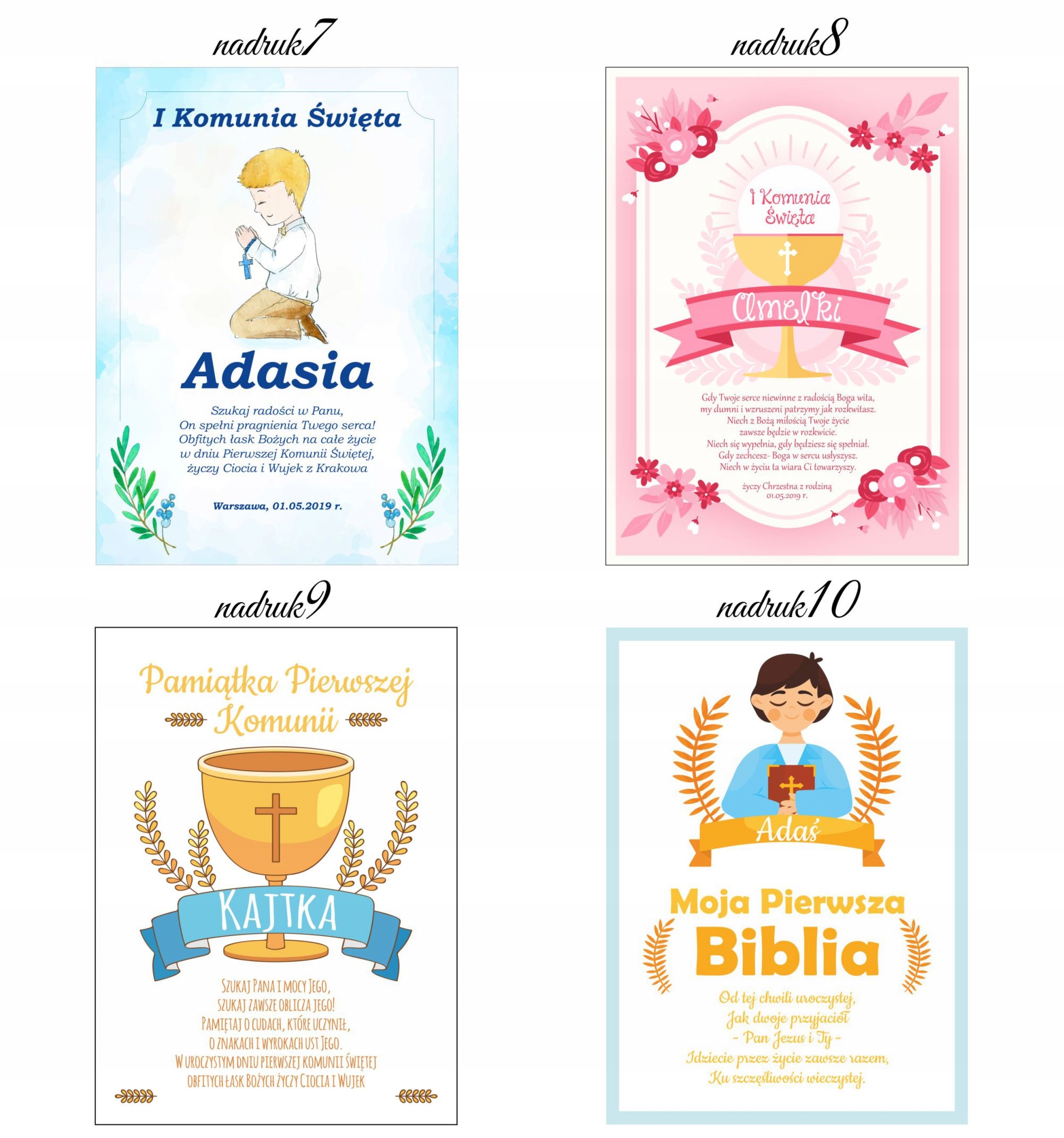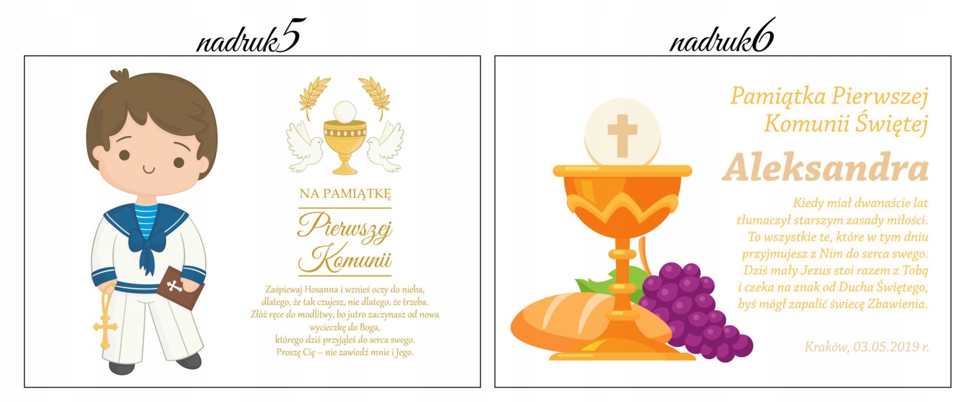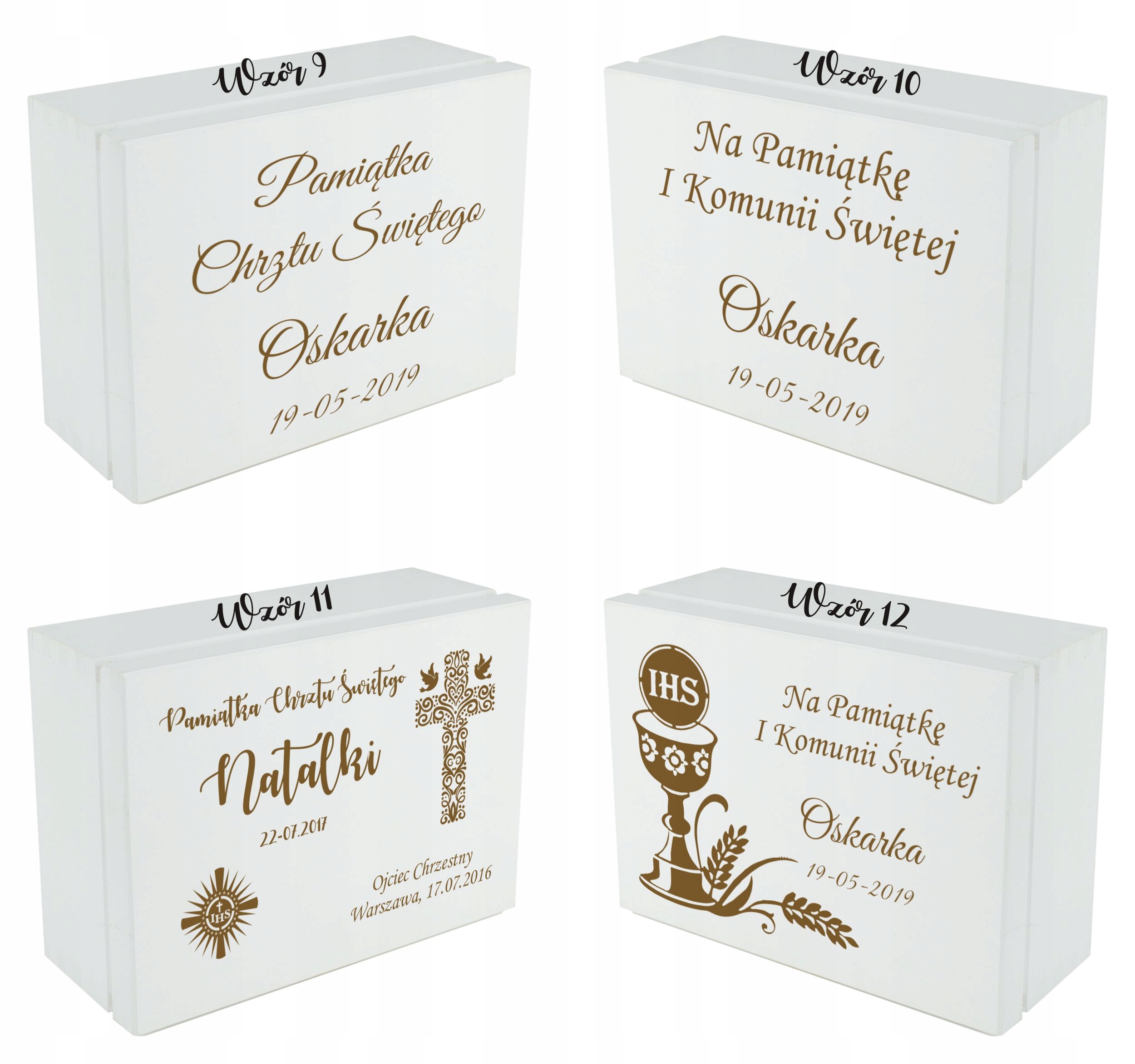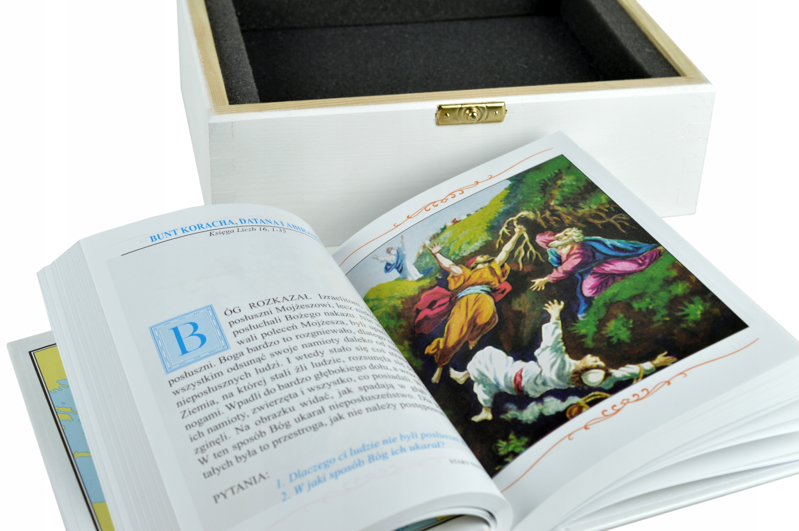 Иллюстрированная детская Библия, помещенная в деревянную коробку, — интересная идея подарка к Первому Святому Причастию или Святому Крещению. Мы можем выгравировать индивидуальное посвящение на крышке коробки на основе представленных ниже рисунков. Внутри коробки, на крышке, находится декоративная тарелка с посвящением, вырезанным по размеру, которое также можно персонализировать. Дополнительным преимуществом представленного продукта является отделка из пенопласта, заменяющая древесную вату. Благодаря использованному решению внутренняя часть коробки выглядит стильно и элегантно, а также дополнительно защищает ее содержимое.