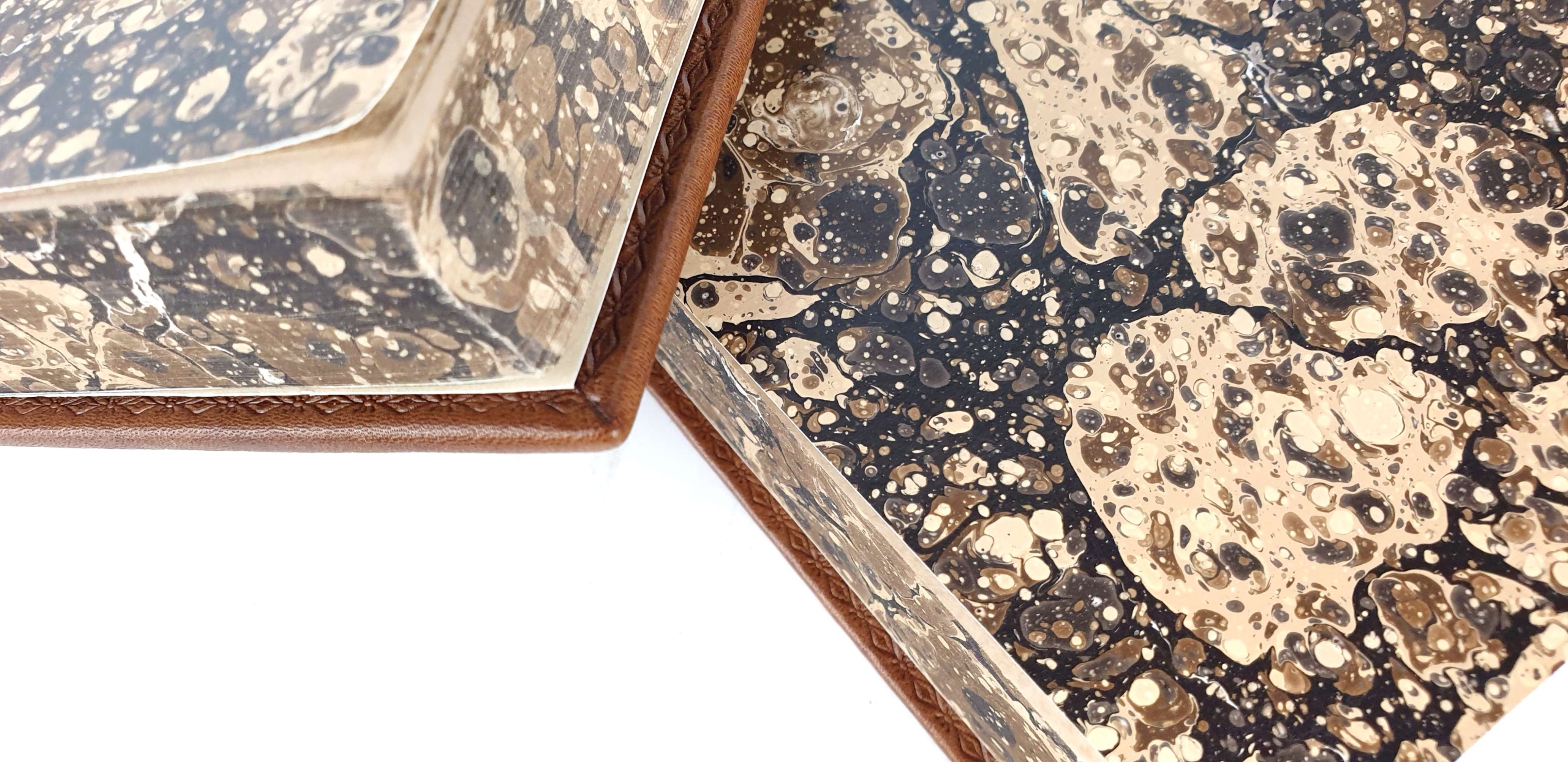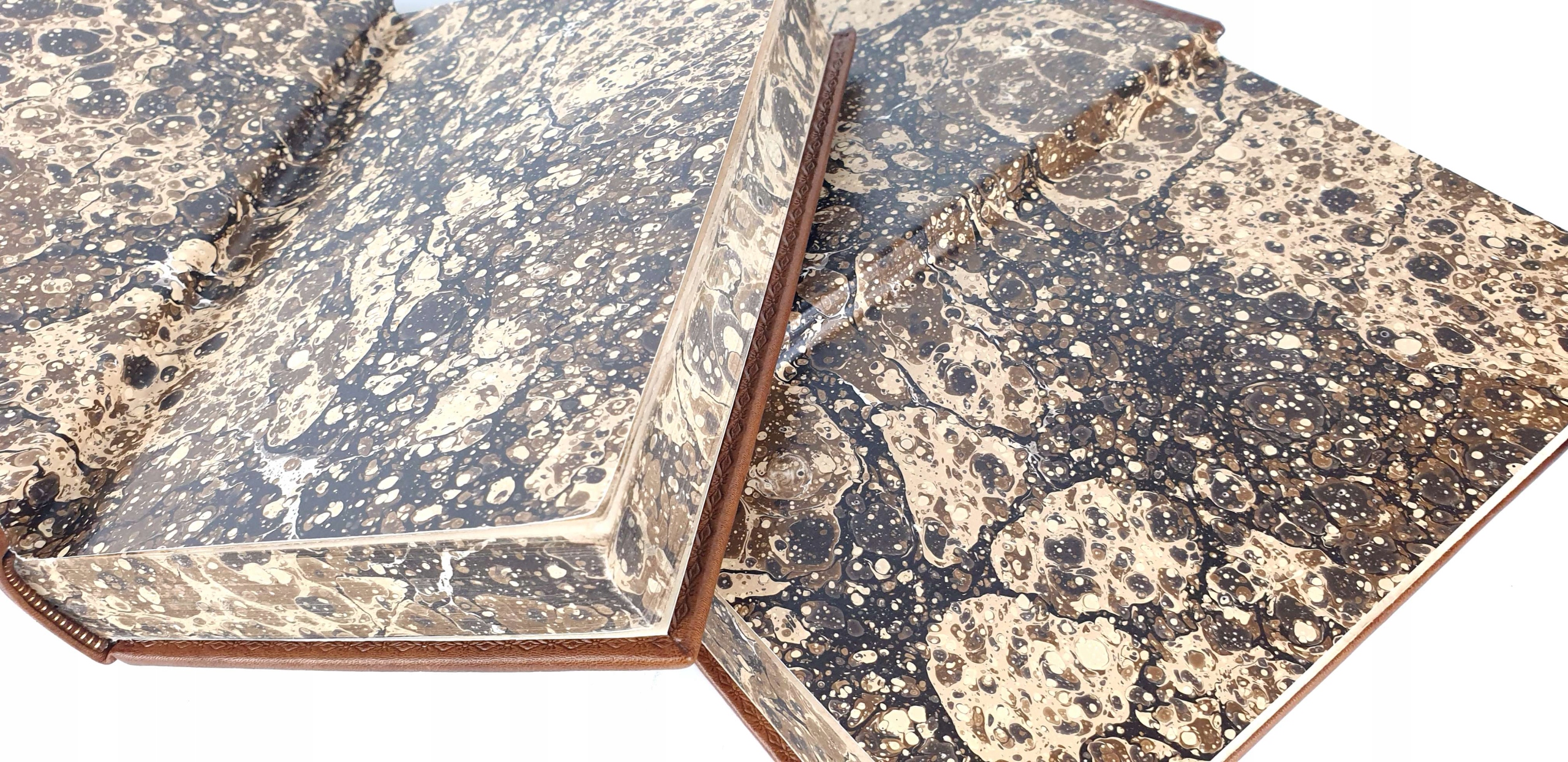 СОВРЕМЕННЫЕ ПЕРИОДЫ В КОЖАНОМ ТВЕРДОМ переплете, СТОРОНЫ И ЛИЦЕВЫЕ СТОРОНЫ С ПОЗОЛОЧЕННЫМ ПОКРЫТИЕМ И ЧИСЛЕНИЕМ, ВЫРЕЗЫ КАРТ С ТРЕХ СТОРОН, БУМАГА С РУЧНОЙ МАРМОРИЗОВКОЙ НА ОБЪЕКТАХ