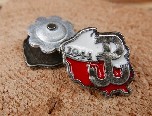 Булавка с мотивом «Сражающаяся Польша», датированная 1944 годом. Булавка изготовлена из металла, покрыта бело-красной эмалью, крепится винтом.