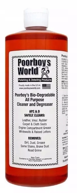 Продукт идеально подходит для удаления уличной грязи и насекомых с поверхности вагона и колес. Это также рекомендуется для очистки моторного отсека. Уборщик Poorboy All Pholeder - это концентрат с щелочным рН, он не содержит аммиака и отбеливаний.
