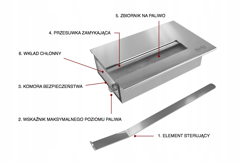 Новый безопасный биоконтейнер, сертифицированный TÜV, имеет дополнительную специальную камеру (3), которая предотвращает выливание топлива из-за случайного переполнения бака (5). Новый безопасный биоконтейнер также имеет указатель максимального уровня топлива (2) и впитывающую вставку, снижающую расход топлива (6) и защищающую от проливания биотоплива из-за опрокидывания устройства (даже в случае случайного опрокидывания биокамина с горящим топливом). в контейнере). Пламя в биоконтейнере гасится с помощью подвижной заслонки (4), закрывающейся с помощью специальной ручки (1), поставляемой в комплекте с устройством.