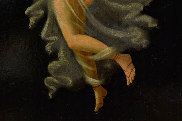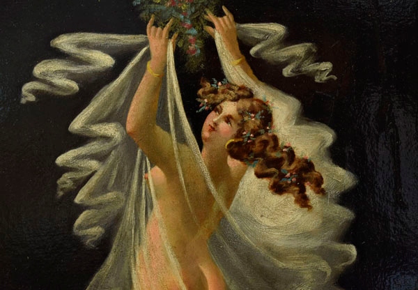 Около 1900 года старая картина "Флора" Богини Цветов Масло. h1> Старое масляное изображение, нарисованное на тарелке. Картина представляет флору, римскую богиню цветов, весна и процветает. Флора изобразила как молодая женщина, полуоткрыта, танцующая, держа букет красочных цветов над головой. h1> изображение оформлено в красивой ручной раме, покрытой хвомами. Кадр: