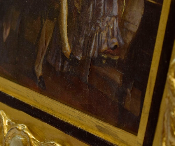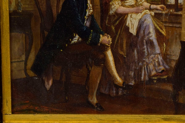 Старое изображение, нарисован в печати. Изображение представляет элегантную салонную сцену в стиле Rococo. В центре композиции мы видим, как несколько аристократов говорят в большом окне гостиной. Женщина одета в богато украшенное платье с кружевом, жемчугом и декоративным головным убором. Человек одинаково элегантно одет - в бархатистых хвостовых, ярких чулках и парике. Изображение имеет очень небольшие трещины. H1> изображение оформлено в красивой ручной раме, покрытой золотым пламенем, что является бесплатным дополнением к изображению. h2> Состояние изображения видно на картинках ниже. h2> Размеры с кадром: h1> 40 x 31 см h1> Фотографии являются неотъемлемой частью описания изображения.