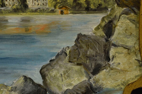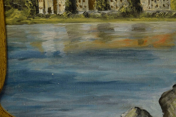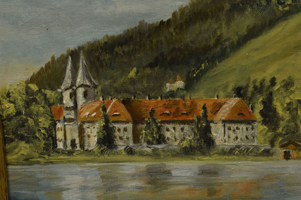 Около 1950 года старая картина, монастырь на озере, масло, 40x39,5 см.