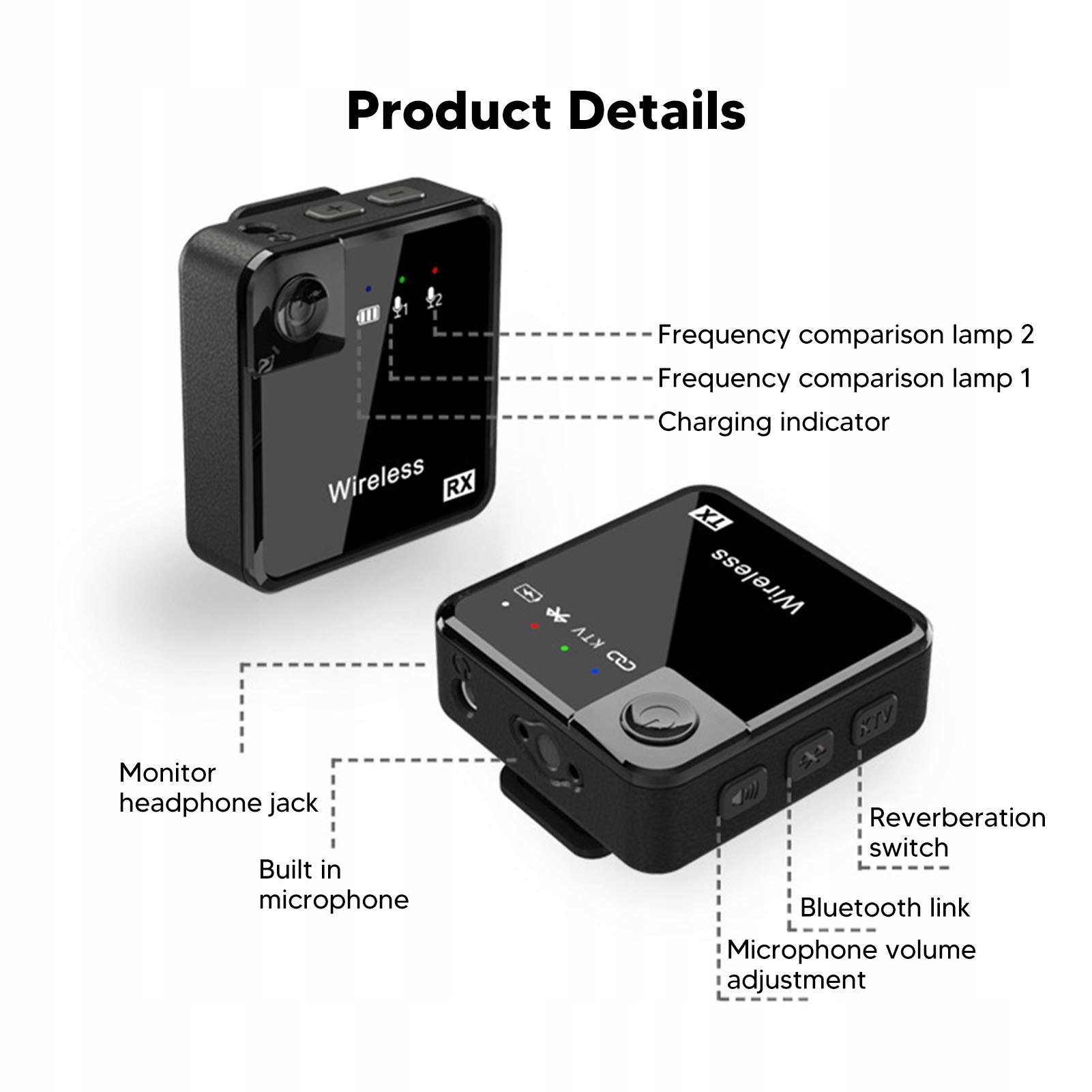 1. Широкий диапазон приложений: Bluetooth Беспроводной связывание микрофон является универсальным, практичным и удобным. Он используется для продажи живых трансляций, снимков на открытом воздухе, эффекта реверберации K, онлайн -обучения, съемок короткометражных фильмов и записи интервью.
