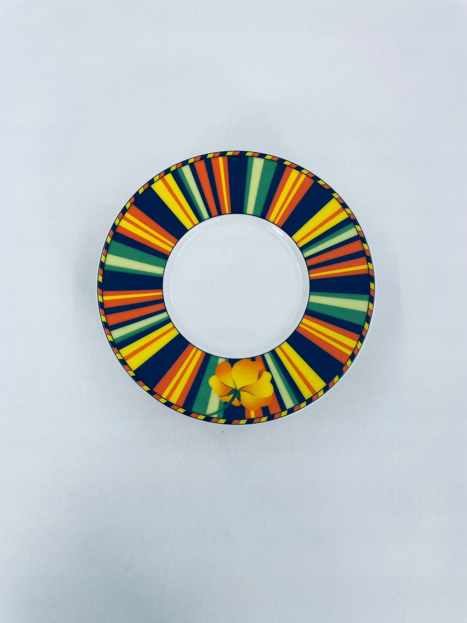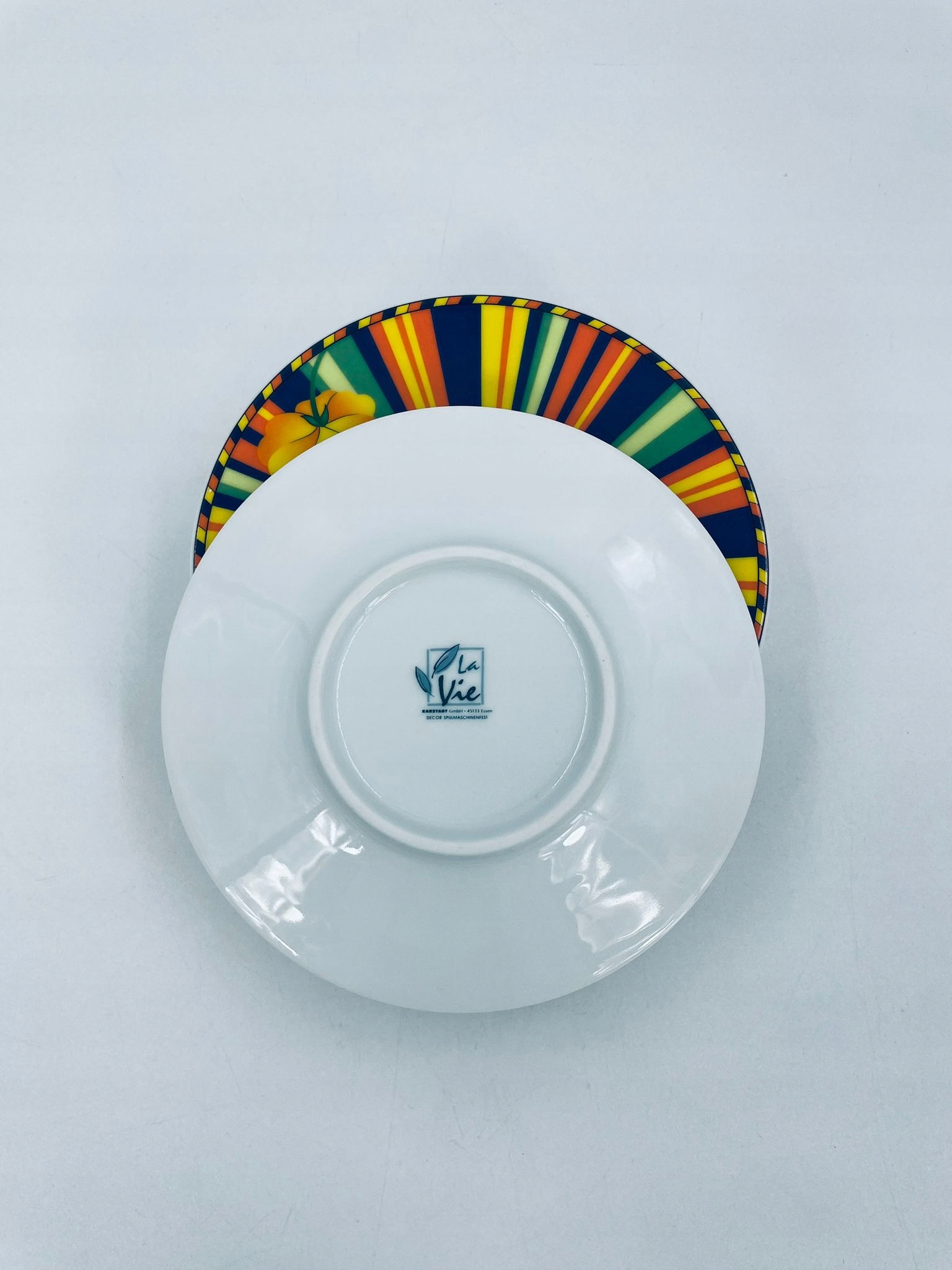 блюдце под чашкой La Vie с декоративным, характерным, многополосным рисунком и цветом.