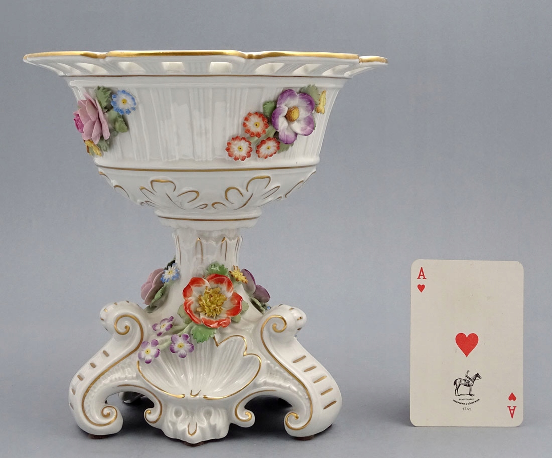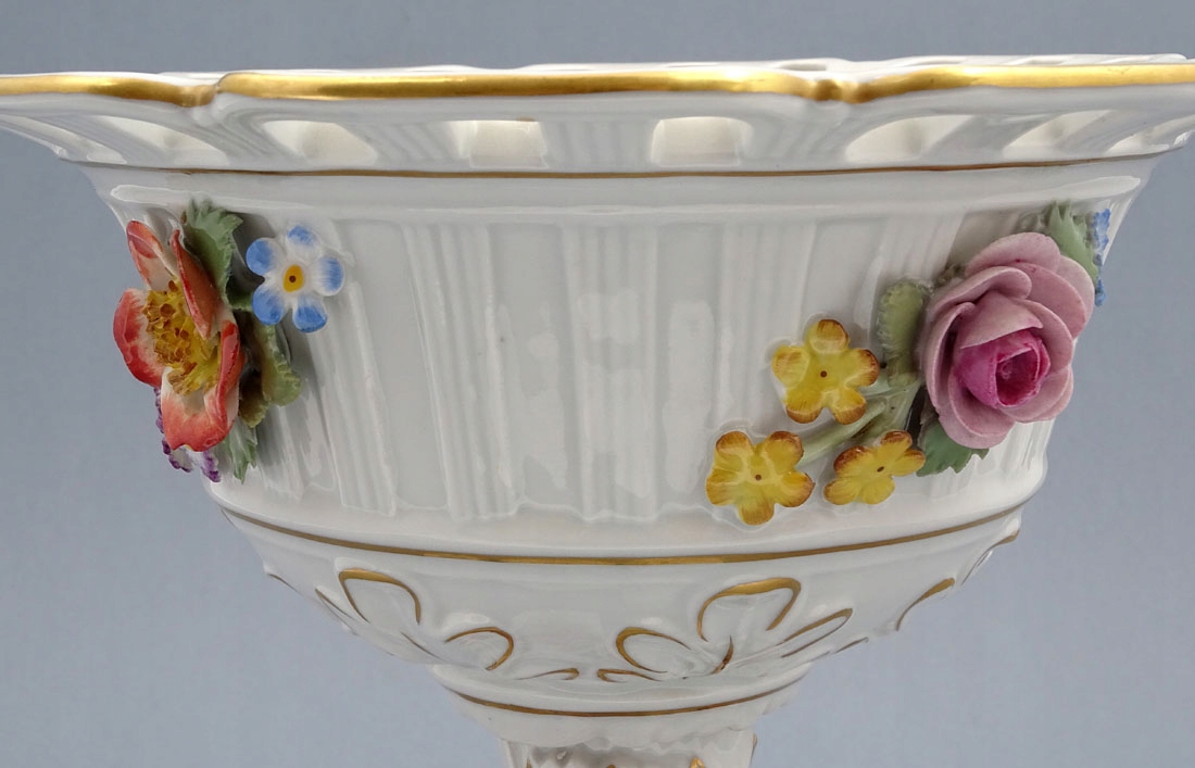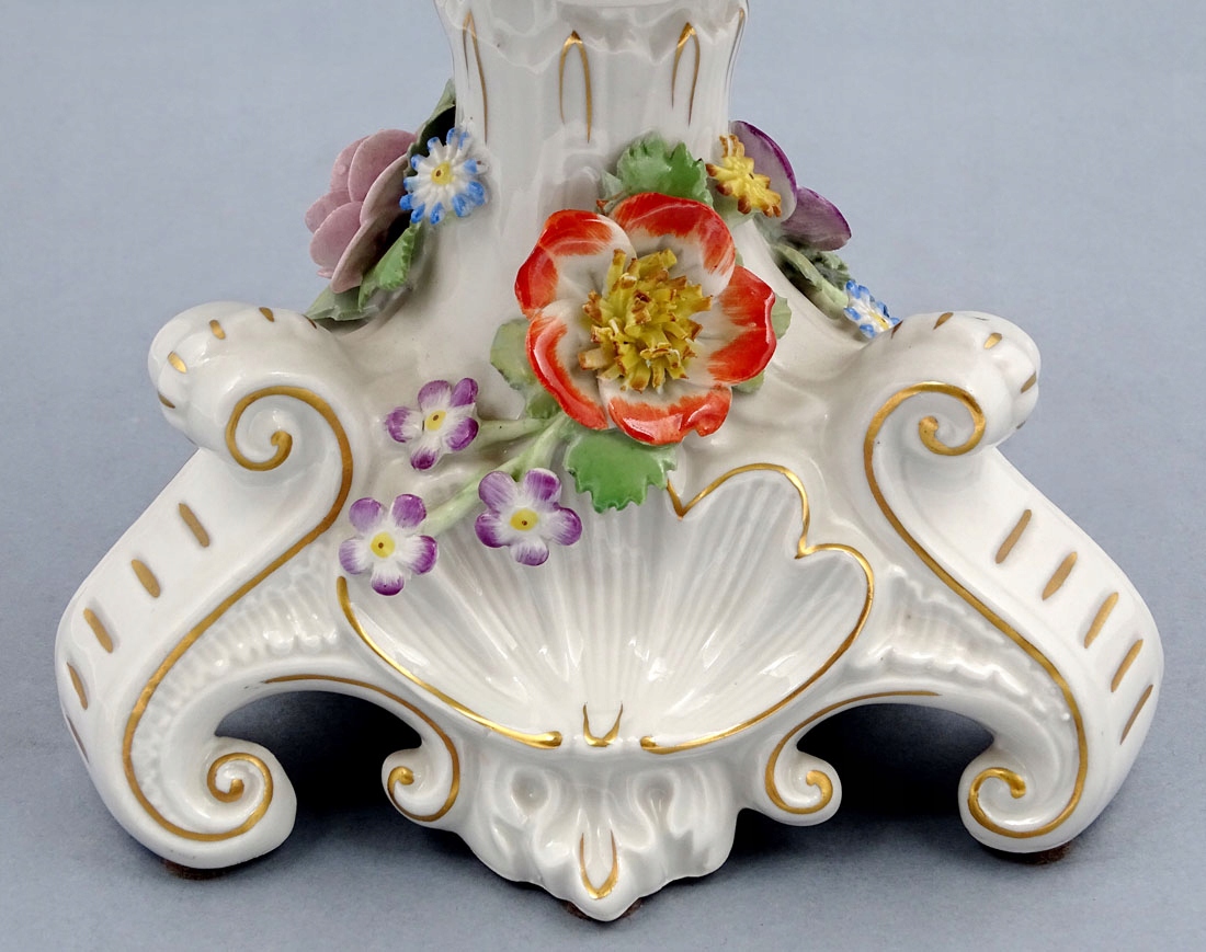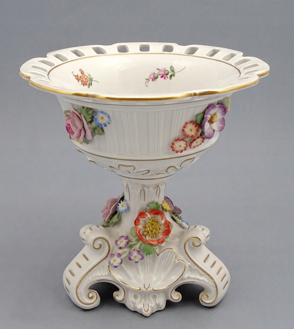 с трехногим основанием в виде рокайльных узоров, с изящными позолоченными ракушками между ними. Вверху переходящая в круглую узкую шахту, украшенную яркими, цельнопластическими цветами, на которой установлена широкая ажурная чаша. Украшен снаружи цветами и тонкими позолоченными узорами, а зеркало небольшими цветочными веточками. Воротник сильно расширенный наружу, позолоченный по краю, с ажурными прямоугольными полями.