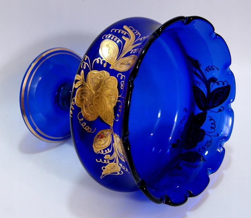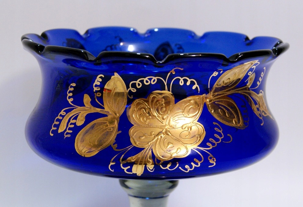 Красивая старинная подставка для торта, сделанная вручную из толстого кобальтово-синего и бесцветного хрусталя. Золотой, рельефный цветочный узор по обеим сторонам тарелки. Конечно, очень редкая вещь. Богемия.