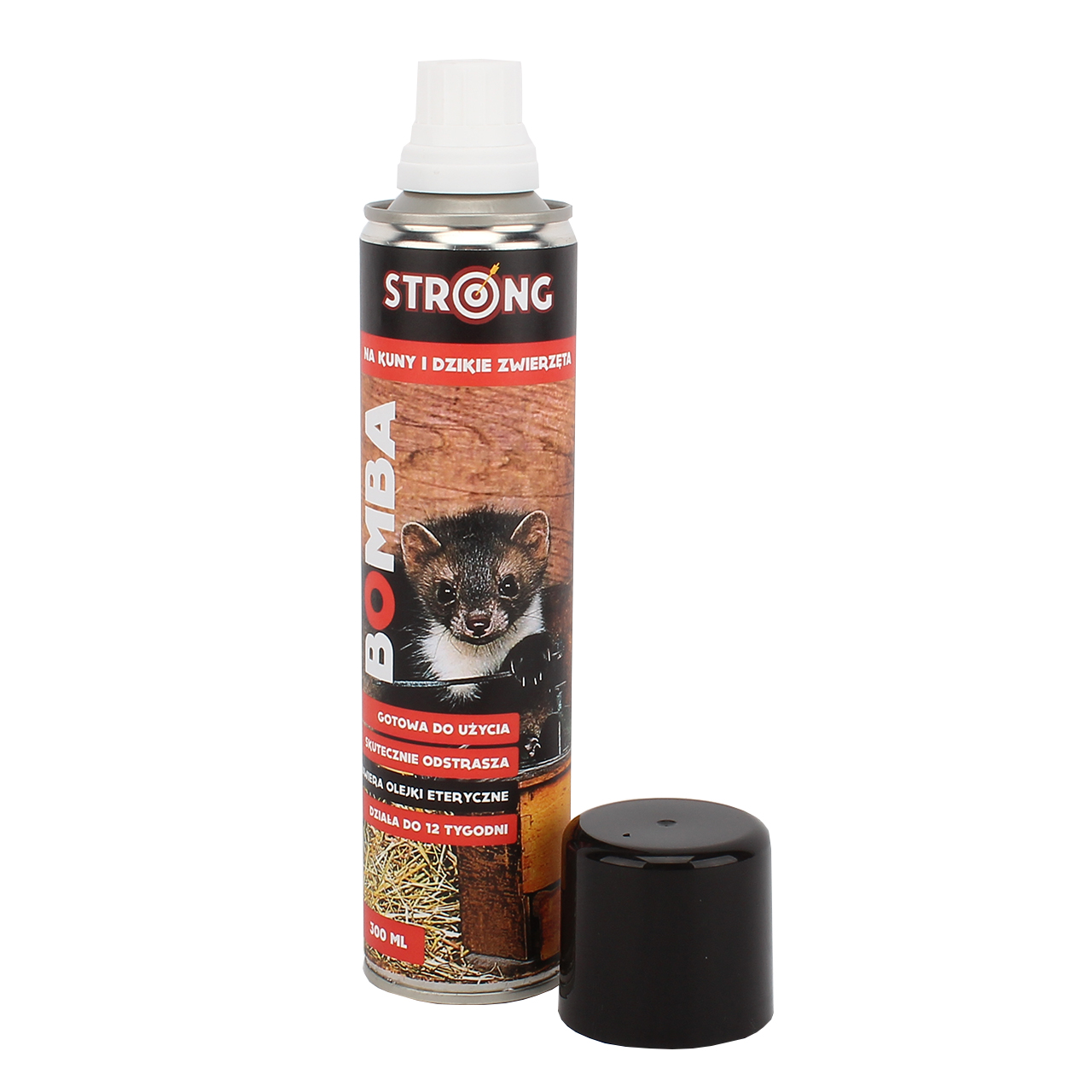 Репеллент в виде удобного в применении туманообразователя БОМБА в виде водной суспензии микрокапсул натуральных эфирных масел, эффективно отпугивающий куниц, лисиц, кротов и полевок, а также кабаны, зайцы, кролики и хищные птицы и другие дикие животные. Содержащиеся в препарате пахучие вещества, которые они обнаруживают, эффективно заставляют их убегать от места нанесения репеллента.