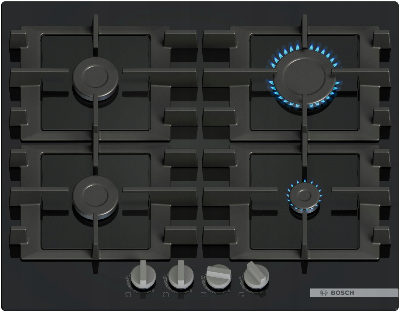 Газовая пластина на стекле шириной 59 см, с 4 горелками с общей мощностью 87500 Вт, с газом легче и с защитой от оттока