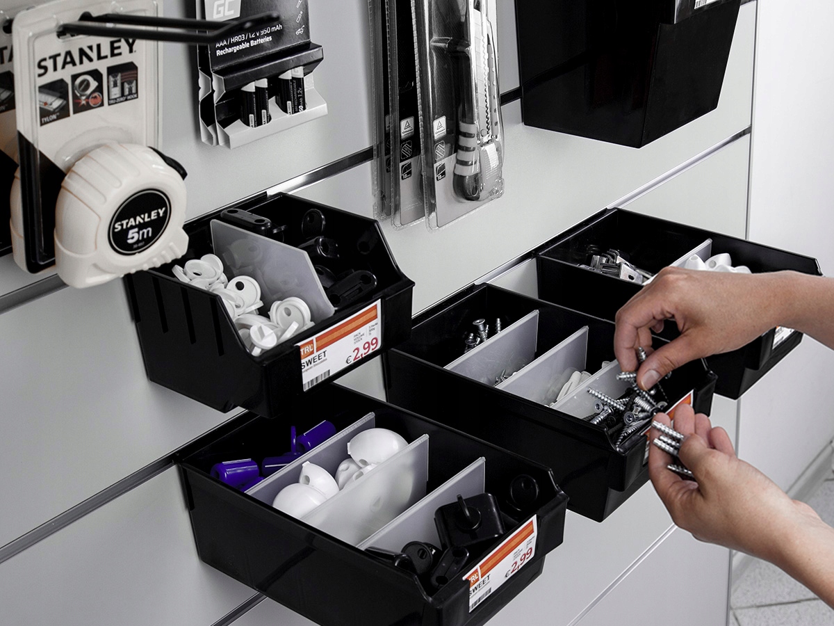 На передней части контейнера имеется место для этикетки с описанием или ценой. Размеры этикетки 7,5х3,0см. Внутри контейнера имеются крепления для перегородок.