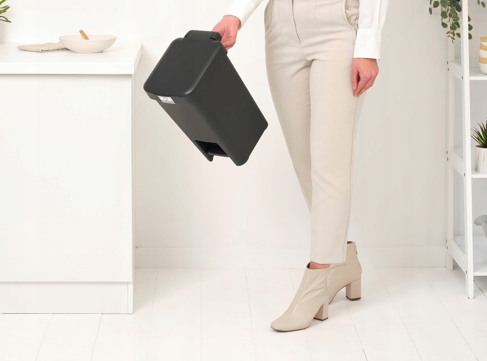 BRABANTIA - StepUp 10 L — идеальный выбор для любителей экологии. Эта педальная корзина, изготовленная на 91% из переработанных материалов, является шагом к устойчивому образу жизни. Разработанный с учетом сортировки мусора, он помогает в дальнейшей переработке и поддержании чистоты в доме.