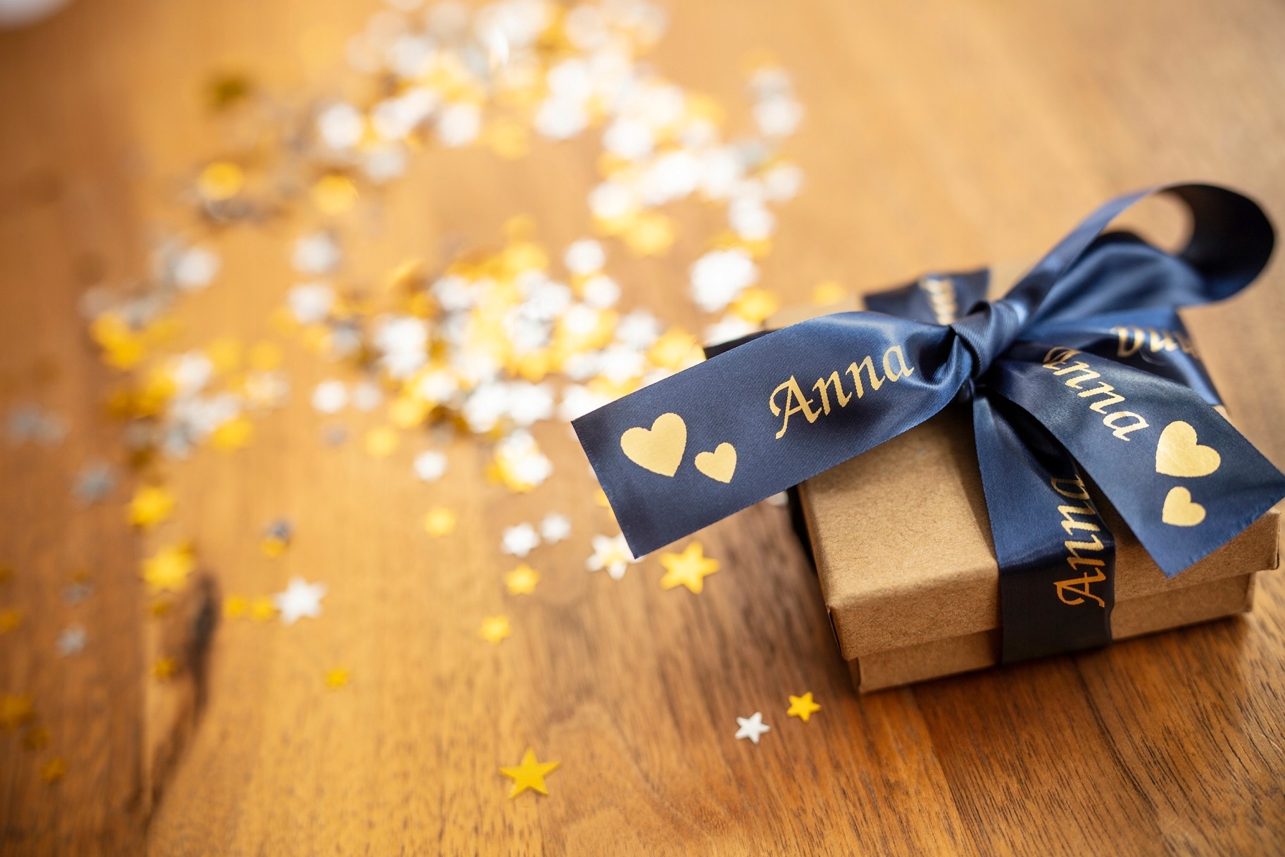 Придайте открыткам и подаркам свою индивидуальность с помощью золотой ленты Brother TZe-RN54 с принтом на темно-синем фоне. Будь то особый случай или вы просто хотите добавить что-то индивидуальное, эти роскошные текстильные ленты — лучший способ украсить ваши подарки.