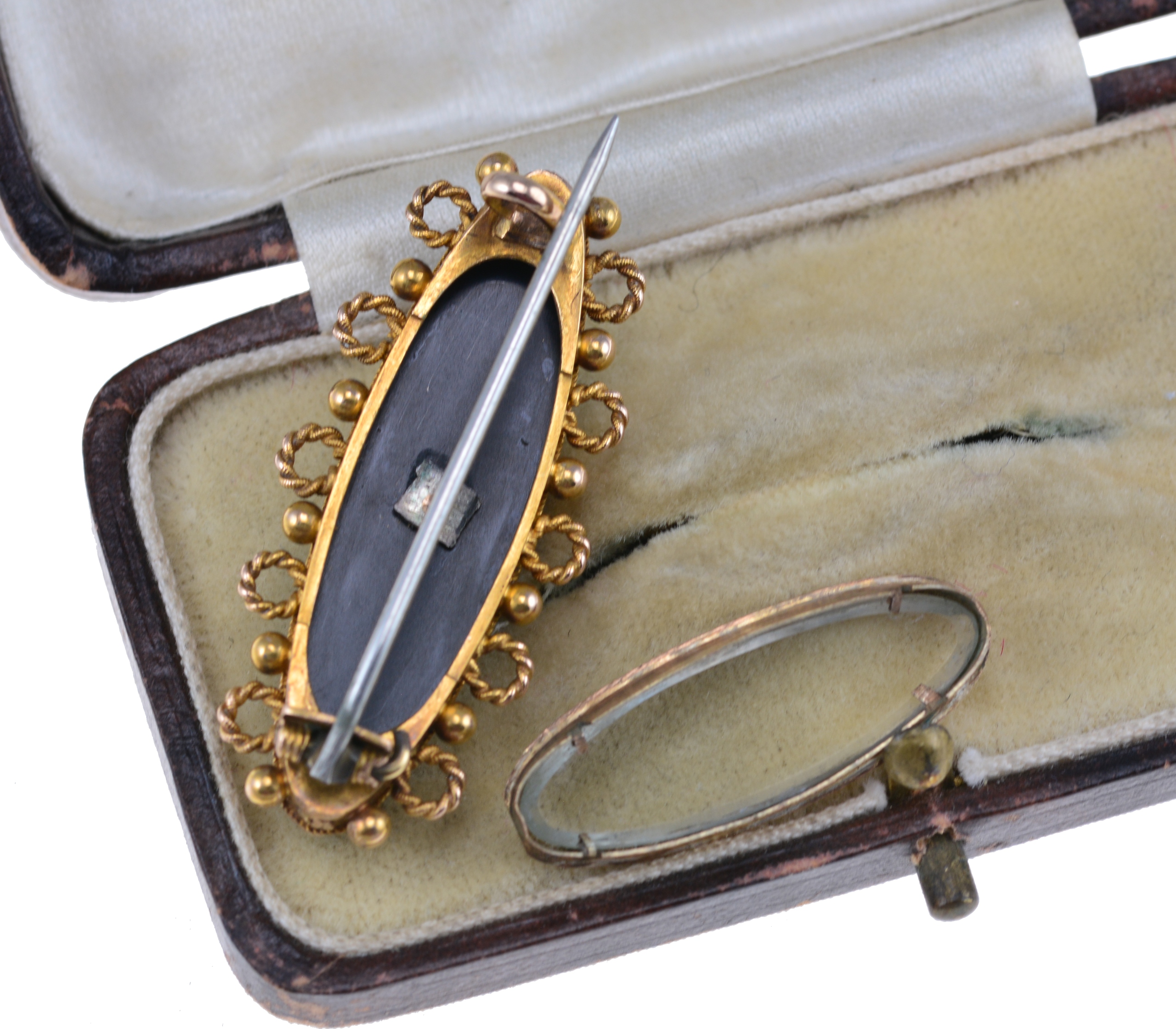 Предмет продажи — викторианская брошь из 15-каратного золота, типичного сплава. ювелирных украшений начала 20 века. Брошь, украшенная ониксом, посередине золотая аппликация в форме звезды, украшенная речным жемчугом – еще один типичный ювелирный мотив викторианской эпохи. Сзади — секретарь со стеклянным окошком. Штифт изготовлен из металла. Состояние очень хорошее.