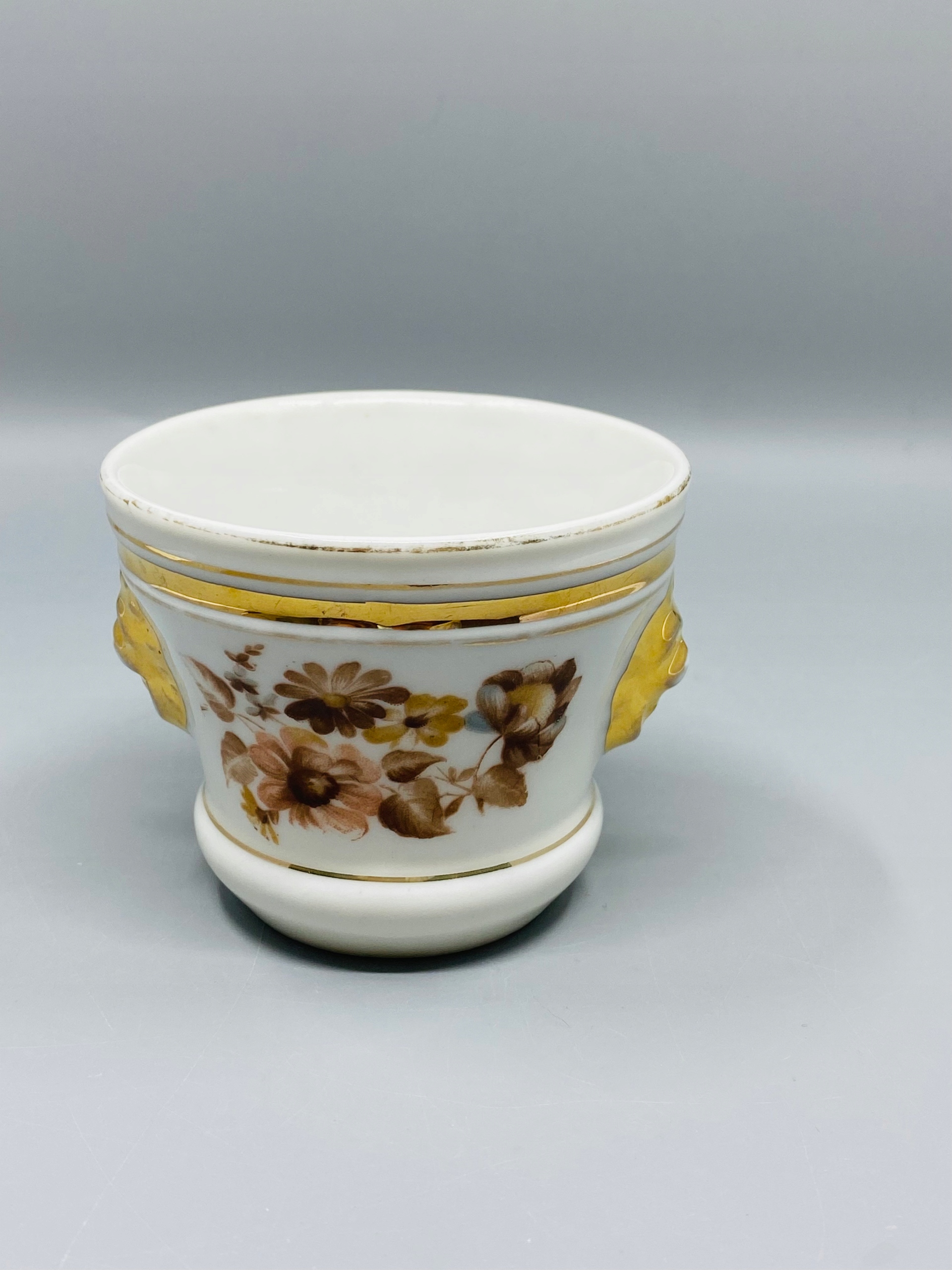 Белый фарфор, украшенный вручную цветочными мотивами. По бокам позолоченные головы львов. Отверстие для слива воды внизу.