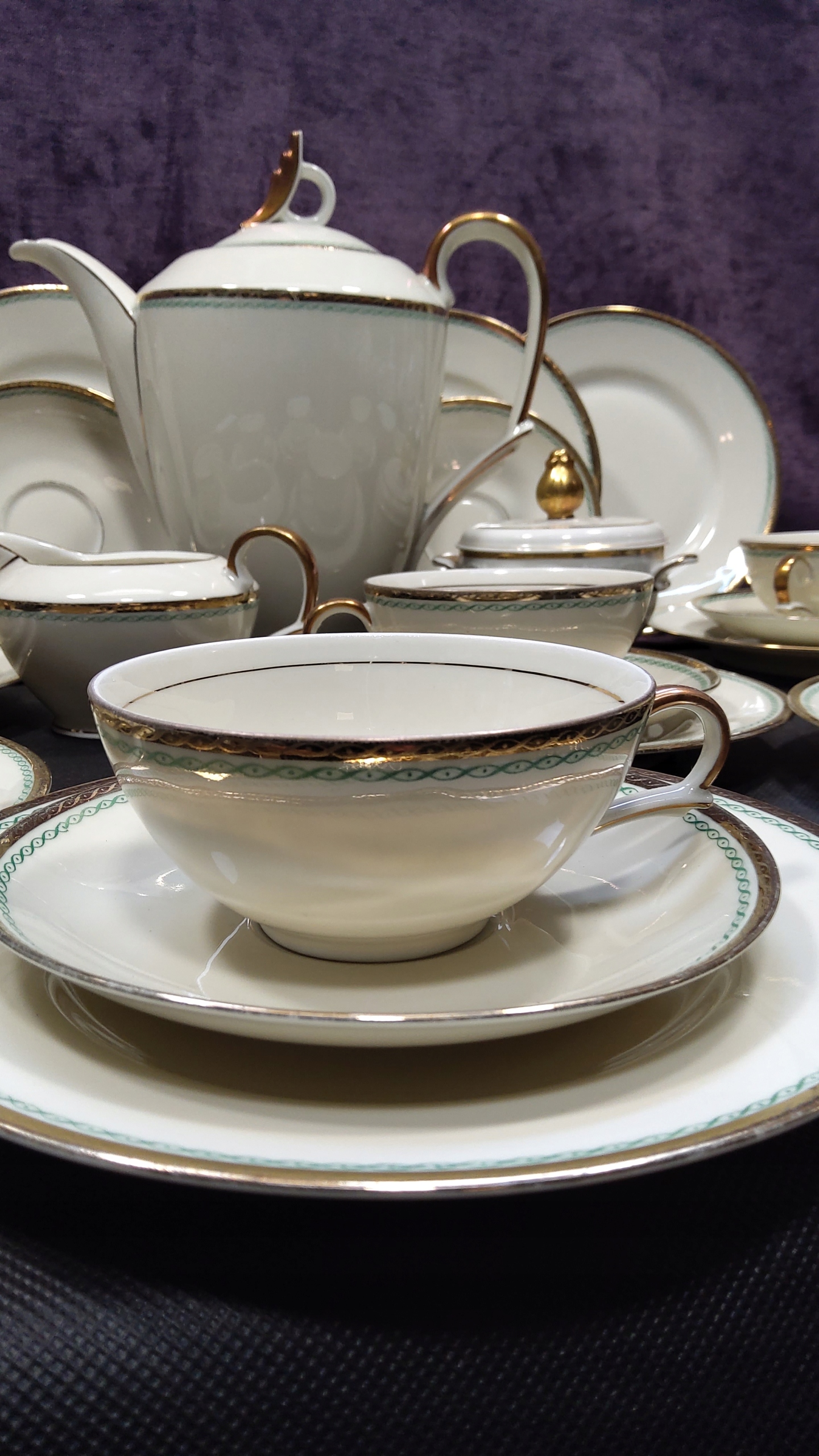 Кофейный сервис для 6 человек из исторического лейбла Карла Тильша из Pre -War Wałbrzych. Определенно экру фарфор, украшенный позолочкой ремня. Добавлено с другой этикетки с аналогичного периода, 6 чашек с декоративной ручкой с высотой 5 см и диаметром инфузии 10 см, 6 стоят 14,5 см и 6 десертных пластин диаметром 19,5 см. Я рекомендую эту фарфоровую классику из коллекционного, ценного лейбла.