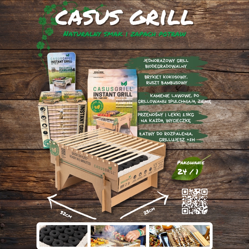 Экологический гриль Casusgrill ™ является не только экологическим, но и очень долговечным, изготовленным из древесных брикетов Quick Oxylite ™, изоляционных световых лавовых камней, натурального бамбука и картонной упаковки. Гриль Ecological Casusgrill ™ прост в освещении благодаря использованию Quick Oxylite ™, он готов к гриле за 5 минут и сохраняет тепло в течение более 60 минут. Создает высокую, равномерную температуру, которая обеспечивает адекватное гриль блюд с вкусной, хрустящей на гриле.