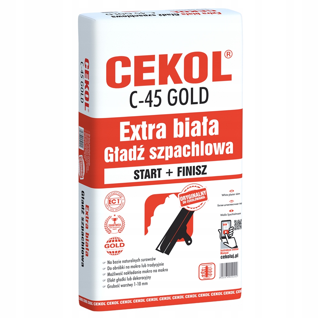 CEKOL C-45 – сухая смесь, производимая на основе белый натуральный гипс высшего класса, белые натуральные наполнители и широкий спектр добавок, которые улучшают, модифицируют, пластифицируют, замедляют схватывание и обеспечивают отличную адгезию к основанию (гипс, кирпич, бетон, пенобетон). CEKOL C-45 – отличная грунтовка для эмульсионных и акриловых красок. Белый цвет позволяет ограничить количество красок для получения полноцветного эффекта. Это отличная основа для обоев. Это нетоксичный в использовании и эксплуатации продукт, полностью изготовленный из натуральных ингредиентов.