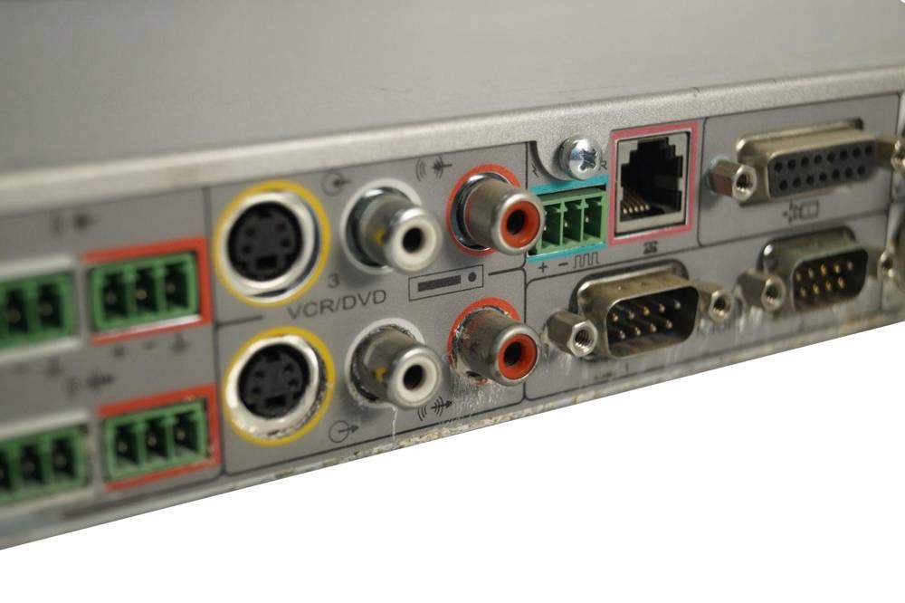 Polycom VSX 8000, часть комплекта, предназначенного для конференц-залов среднего и большого размера с вместимостью примерно до 40 участников. Продается только устройство, без проводов и аксессуаров. Порты устройства покрыты покрытием, которое трудно удалить.