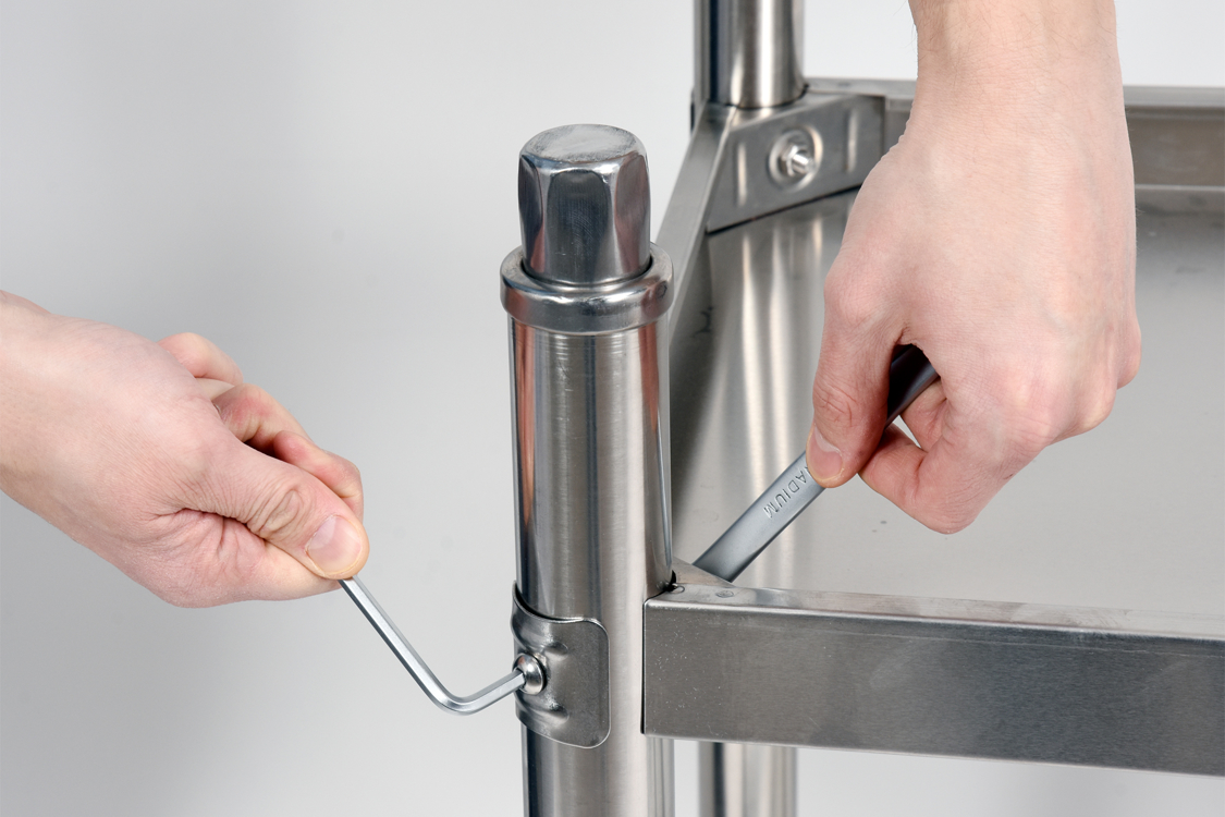 Ножки стола регулируются по высоте в диапазоне +/- 15 мм, что позволяет легко выравнивать стол. Снизу они защищены пластиковыми накладками, которые не царапают пол.