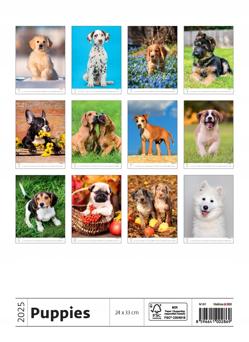Мультибордный календарь PUPPIES 2025, опубликованный Helma 365. Красивые и очаровательные фотографии породистых щенков станут фантастическим подарком для любителей собак. Элегантный переплет календаря, понятный календарь на 2025 год, удобный формат и упаковка в виде прозрачного мешочка с ручкой делают календарь идеальным в качестве новогоднего подарка.