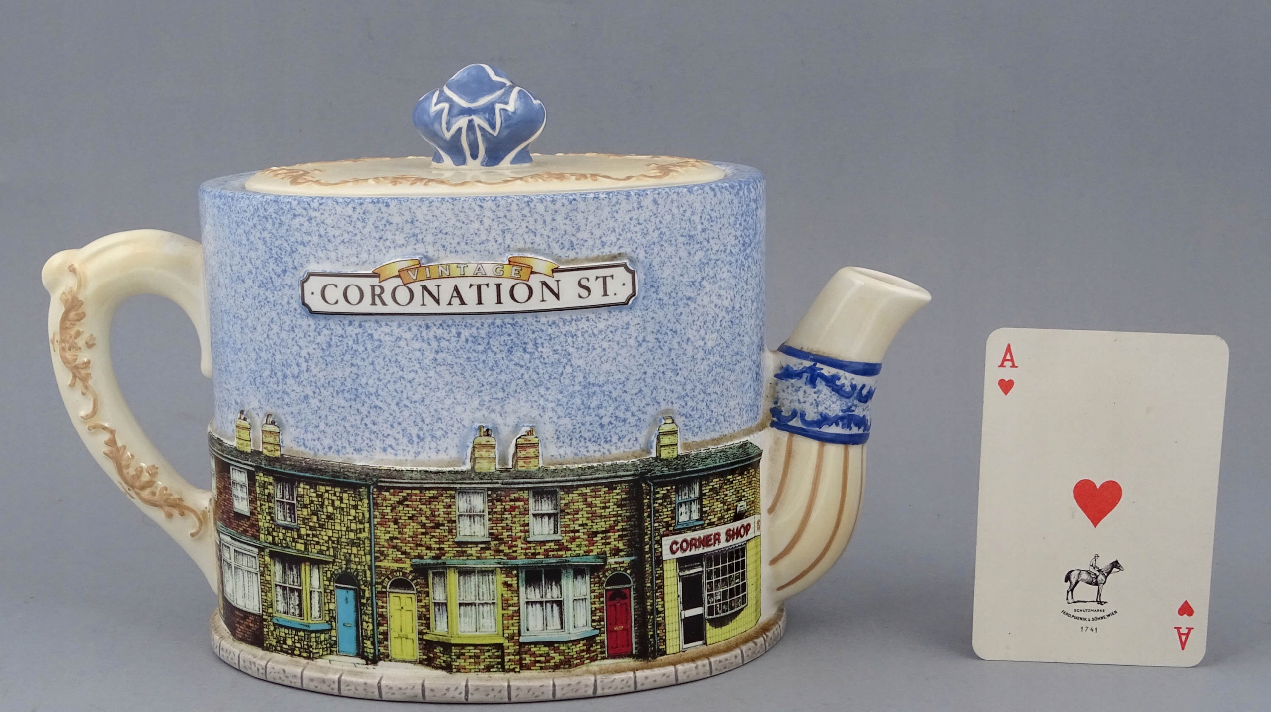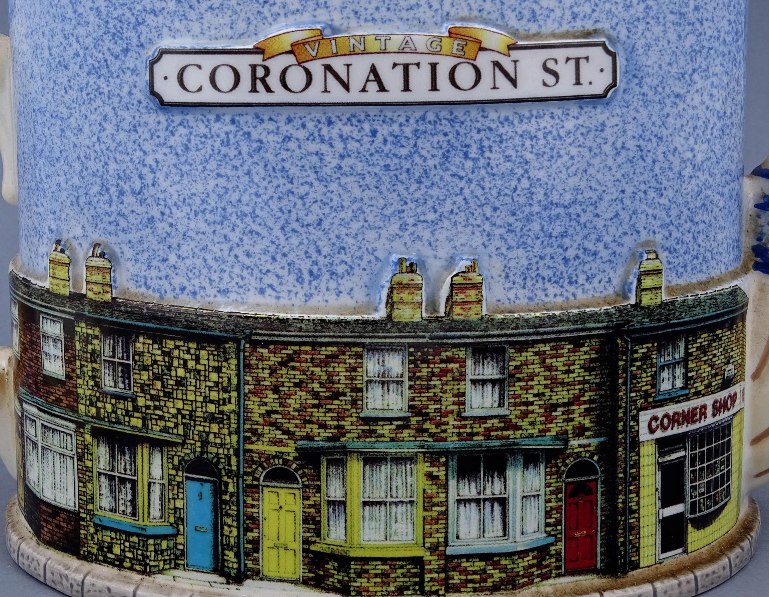 с овальной базовой формой, как и живот. Спустяк, расположенный низко синим рисунком, с другой стороны изогнутый ухо с позолоченными листьями листьев вокруг всего периметра кувшина в нижних украшениях в виде домов, над голубым небом и надписей на обеих сторонах «винтажной коронации». На вершине крышка с позолочкой и тонкой ручкой. Кувшин состоит из керамики и имеет уникальный рисунок "Vintage Coronation Street".