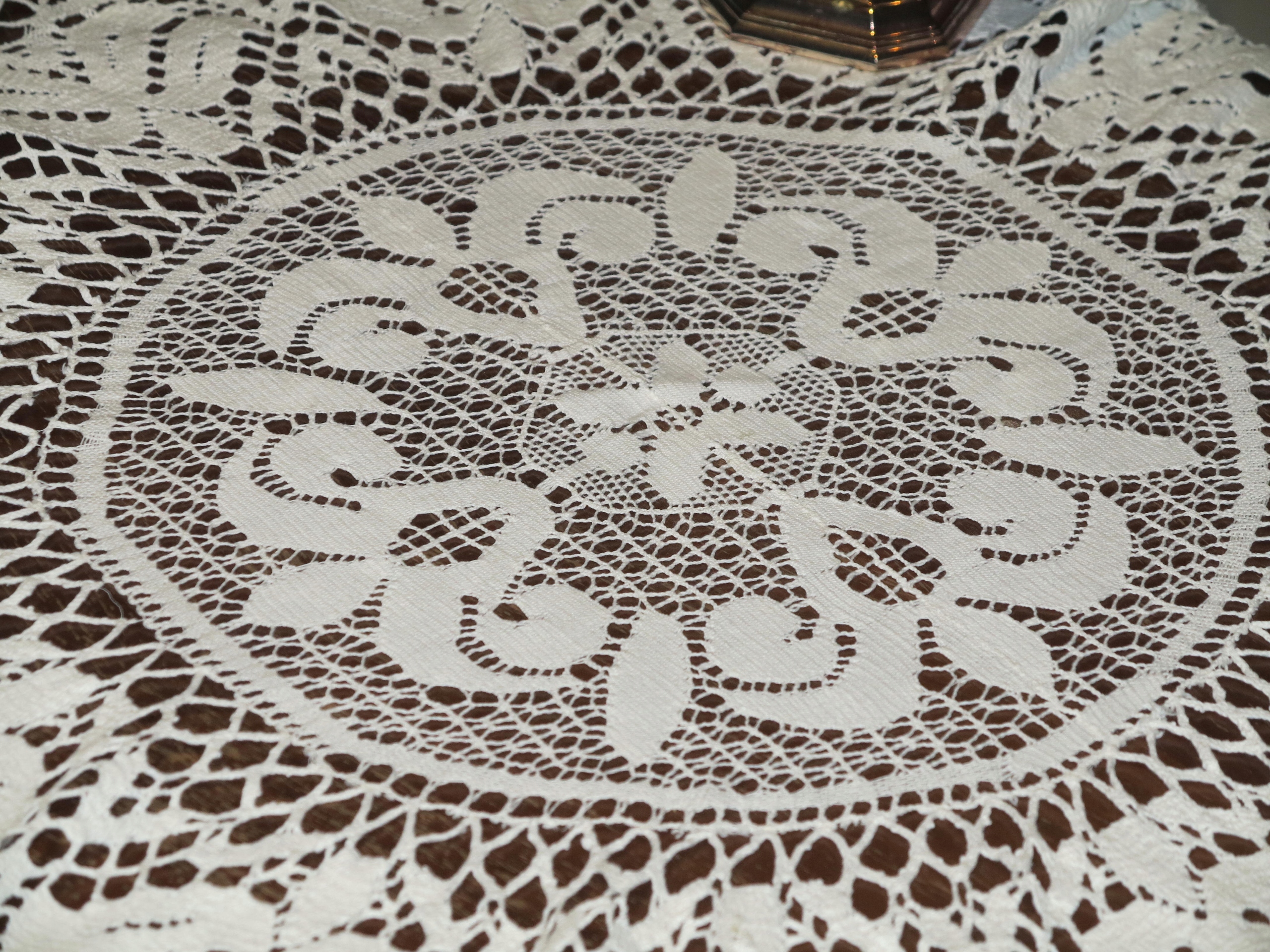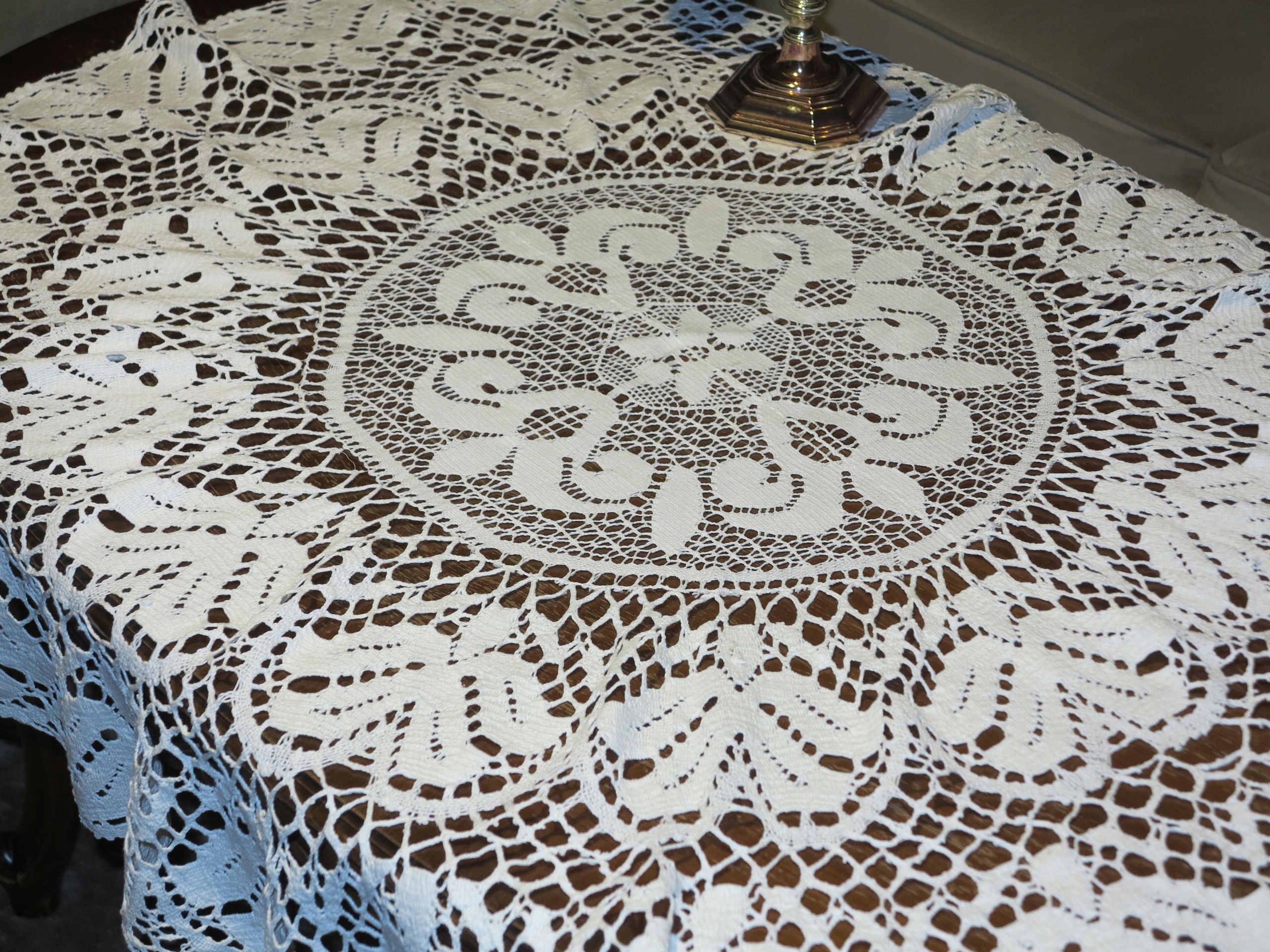 КРАСИВЫЙ ВЕК, БЕЛАЯ КРУГЛАЯ СКАТЕРТЬ, ВСЯ ИЗ ПЛОТНОГО КИРПИЧНОГО КРУЖЕВА.