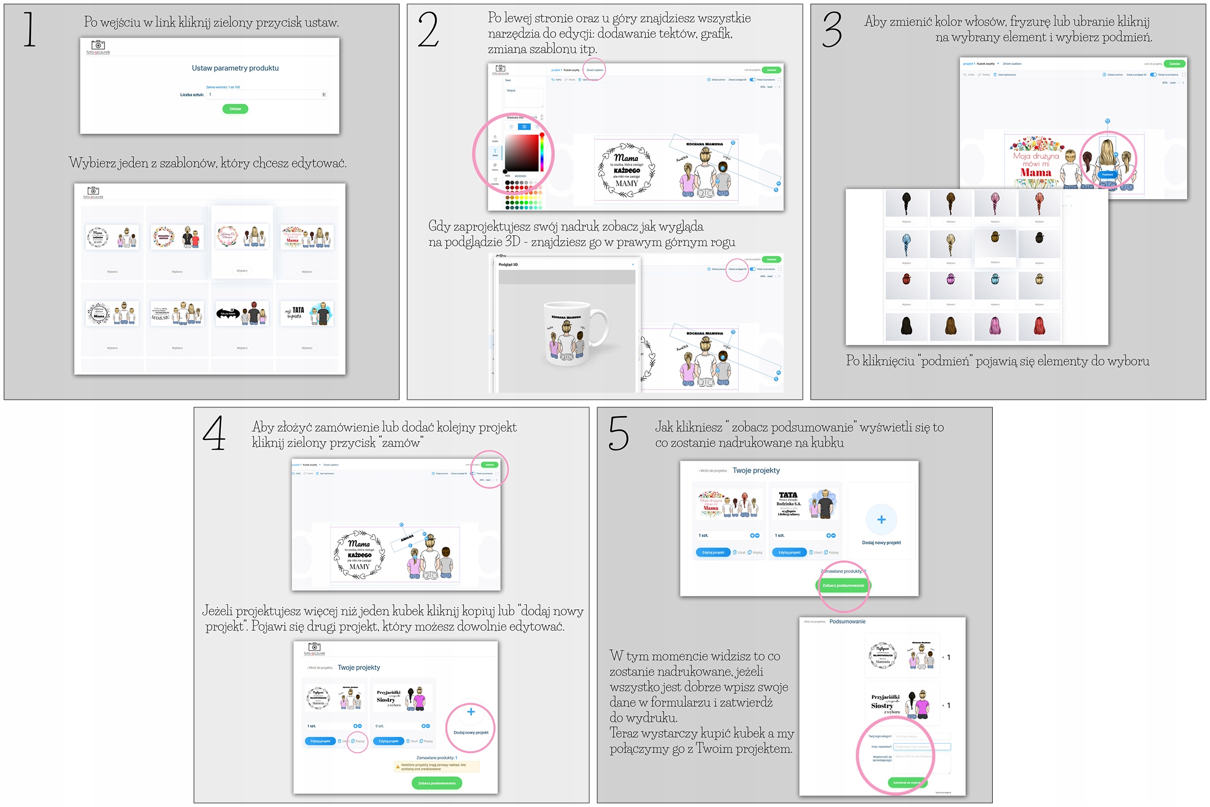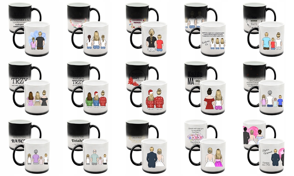 Готовые чашки доступны в создателе, где вы можете внести изменения. Изменение текстов, цвет волос и одежды и конфигурация людей не ограничивается. Ниже приведены шаблоны печати формирования, которые вы можете персонализировать, и фотографии готовых продуктов. Каждый из них доступен в создателе.