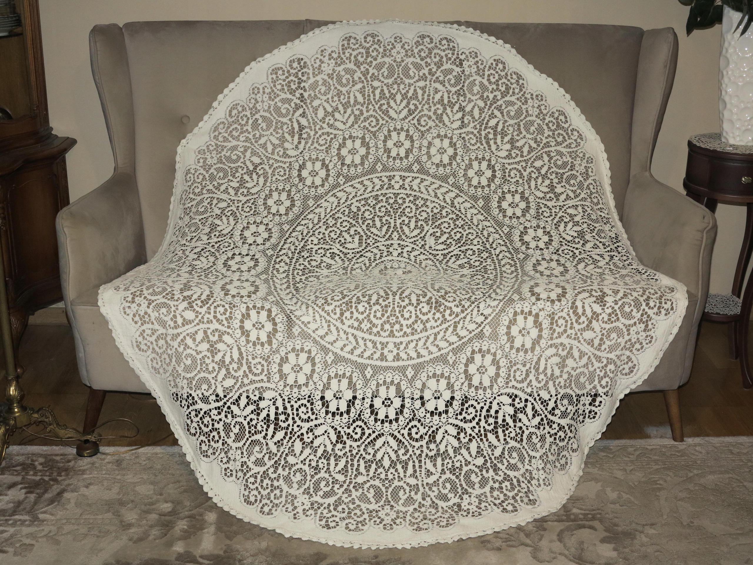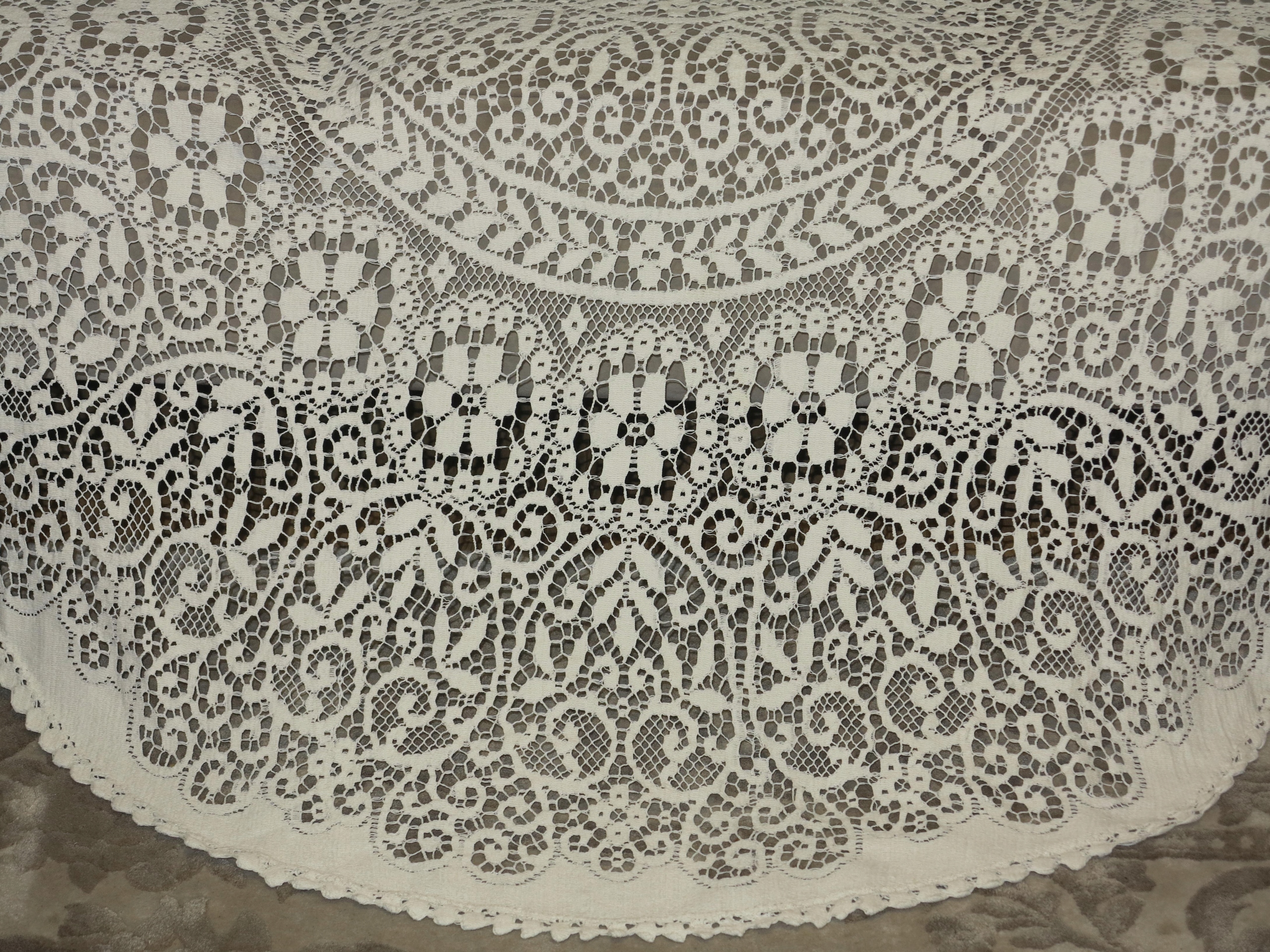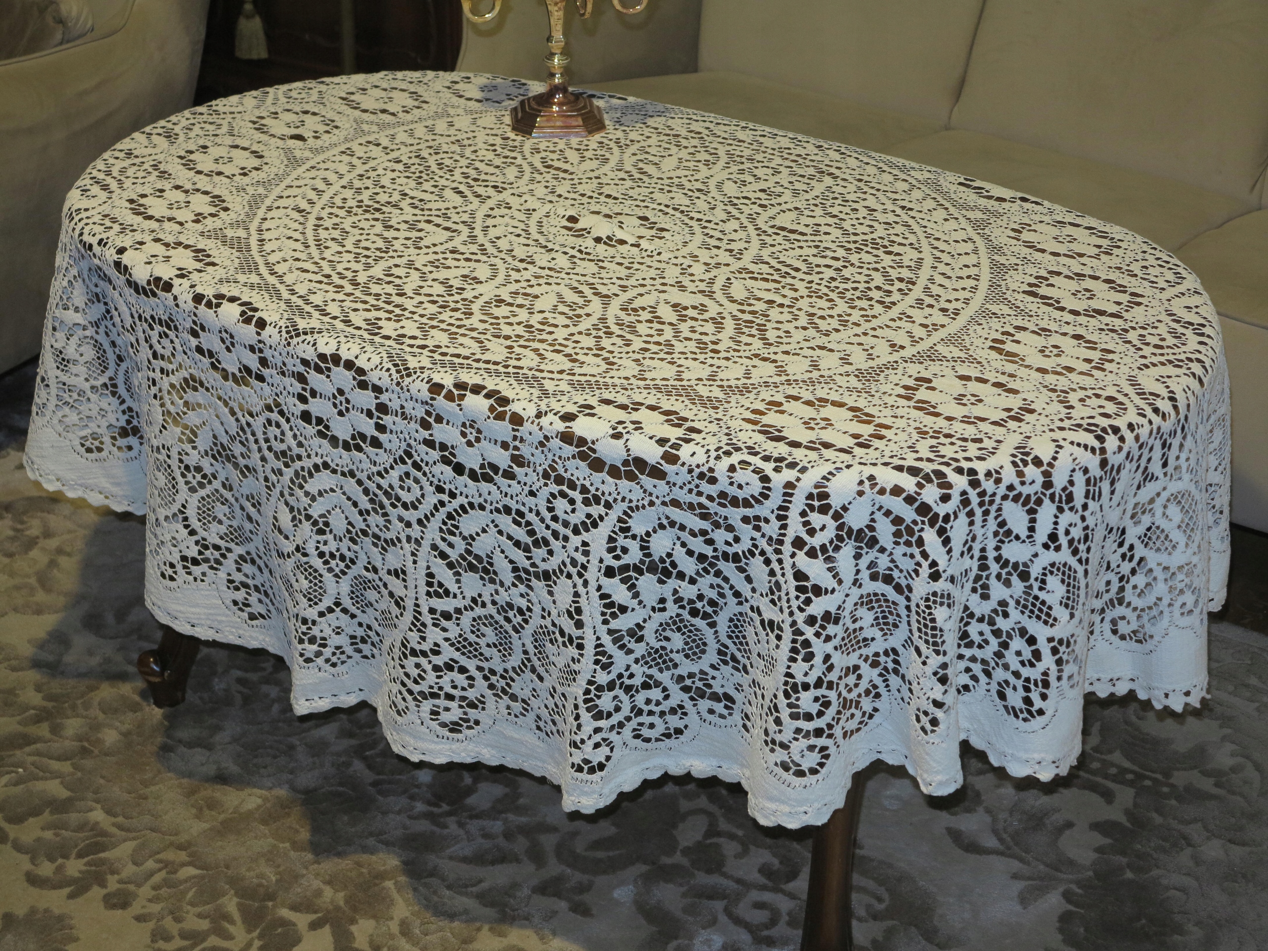 ОЧЕНЬ ОЧАРОВАТЕЛЬНУЮ АНГЛИЙСКУЮ ОВАЛЬНУЮ СКАТЕРТЬ ИЗ Хлопкового МАШИННОГО КРУЖЕВА, С ОЧЕНЬ ДЕКОРАТИВНЫМ УЗОРОМ И АЖУРОМ. ПОХОЖЕ НА ГИПУРУ. КРЕМОВО-БЕЛЫЙ ЦВЕТ