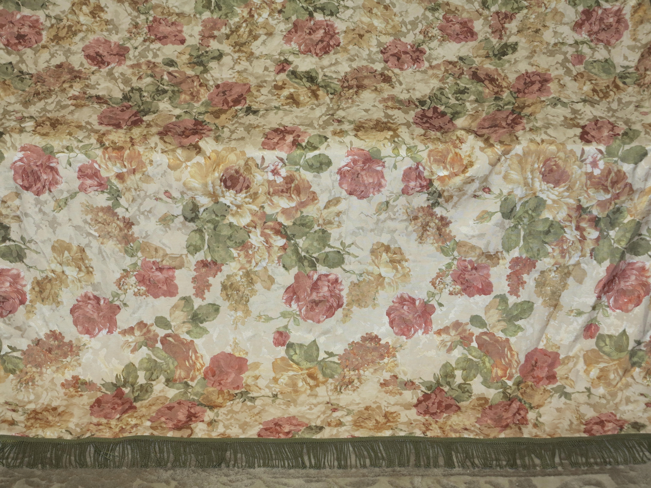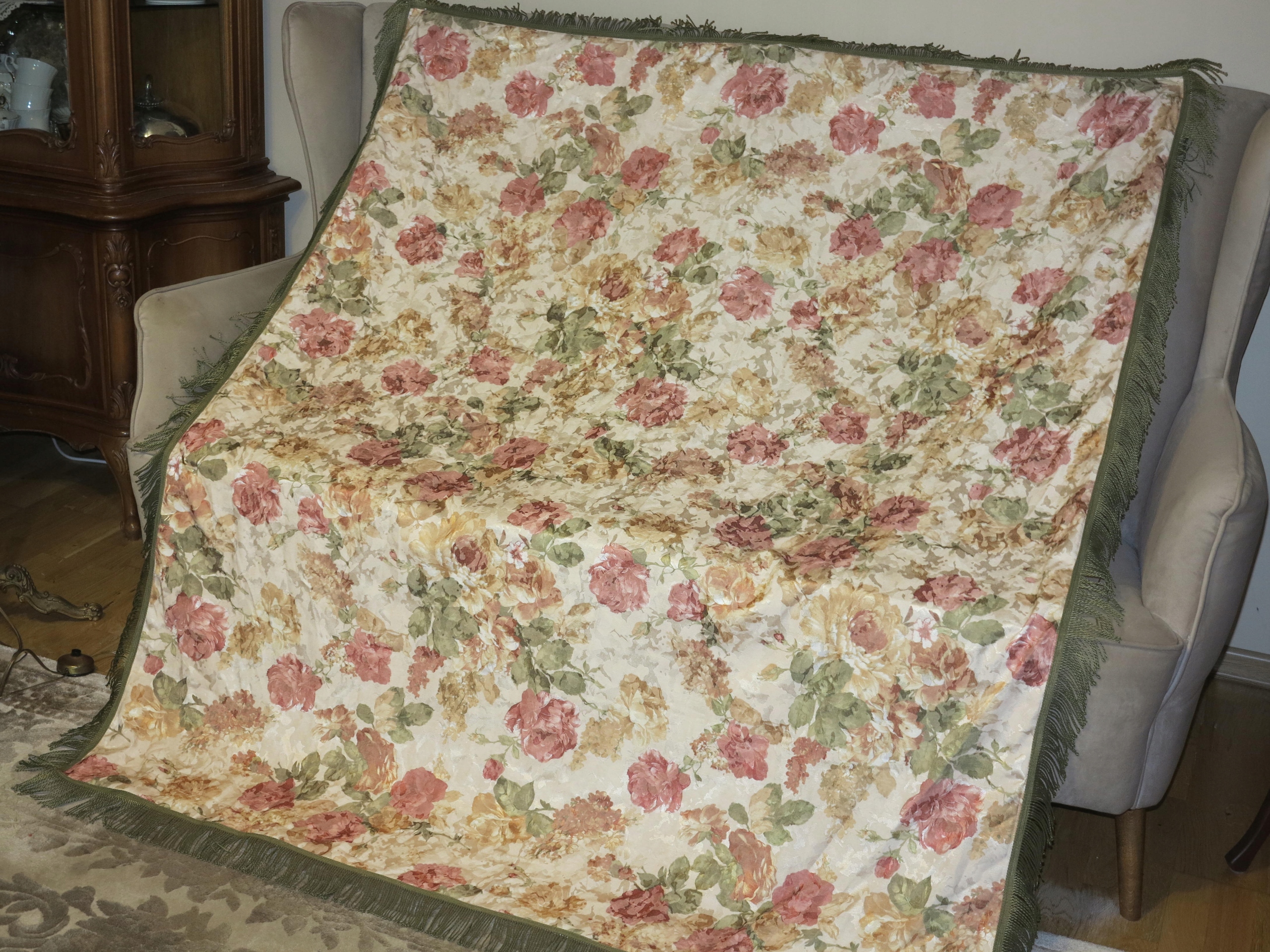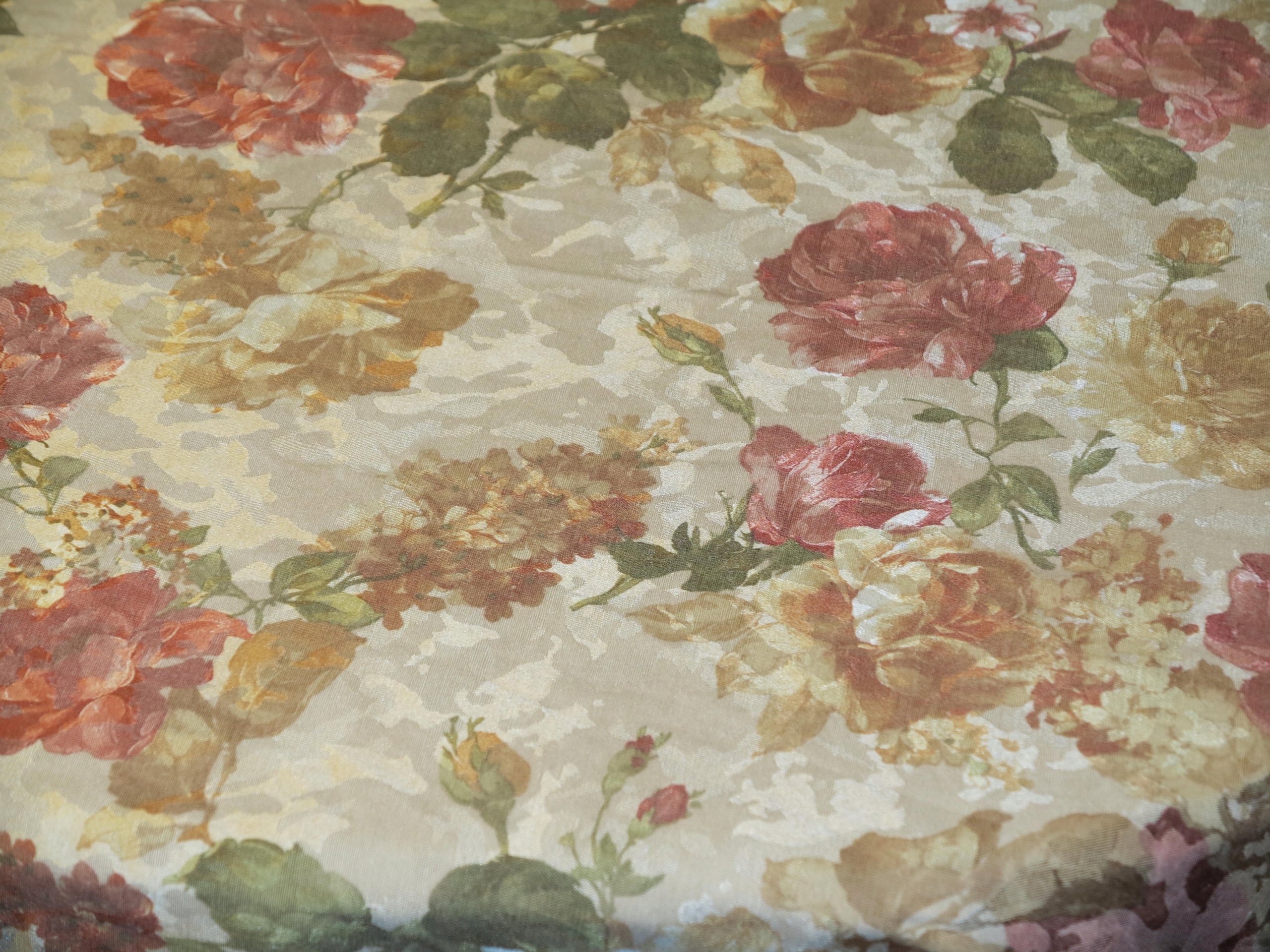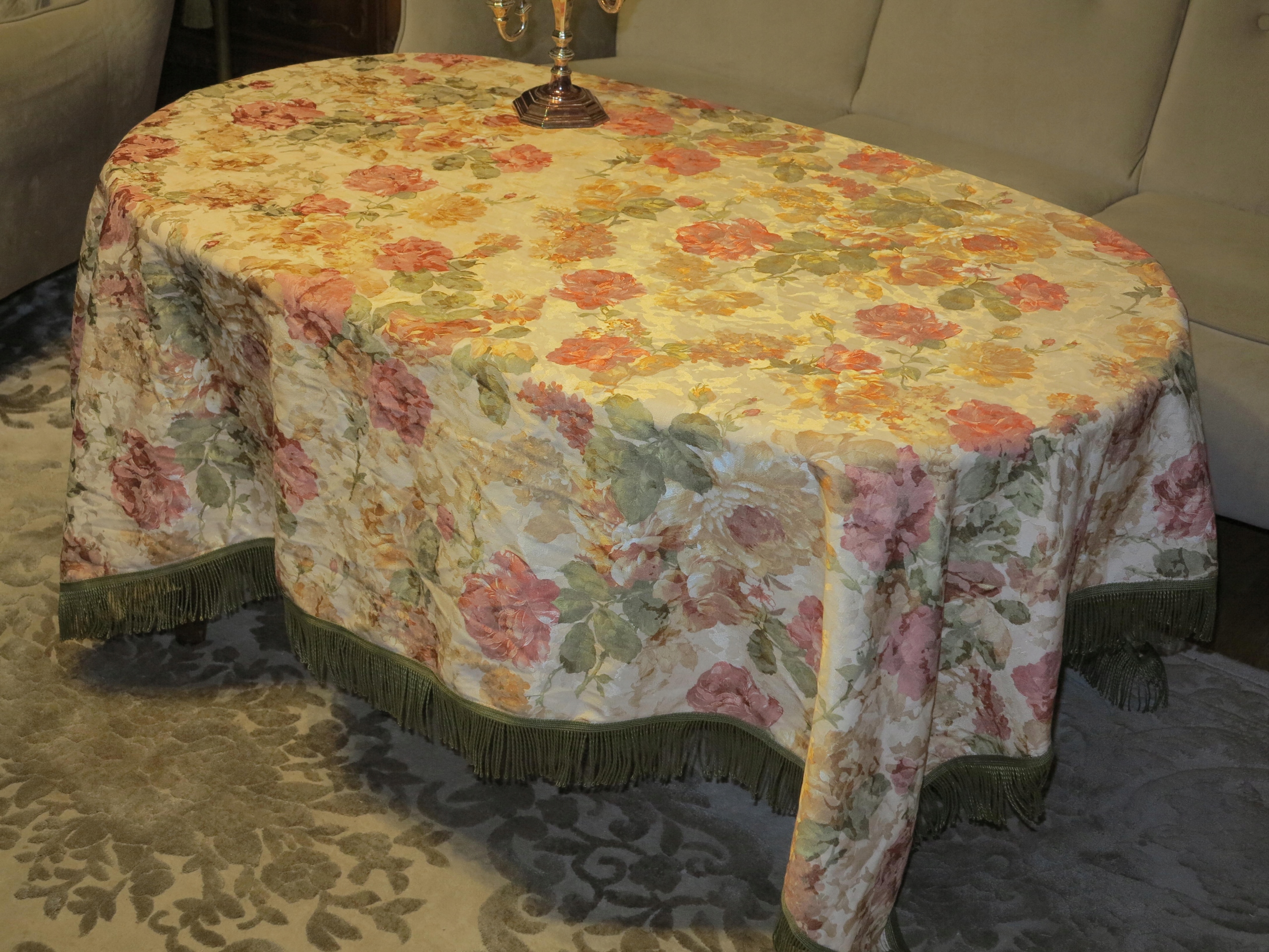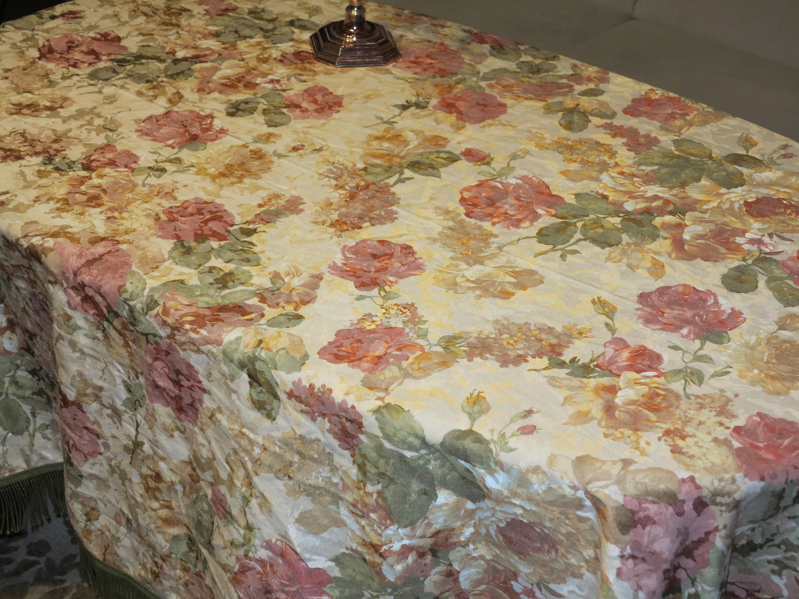 Красивая английская скатерть с большими очаровательными букетами роз и сиреневых филиалов, расположенных вокруг полос. На ткани дополнительный узор. Ткань в основном является хлопчатобумажной жаккардовой