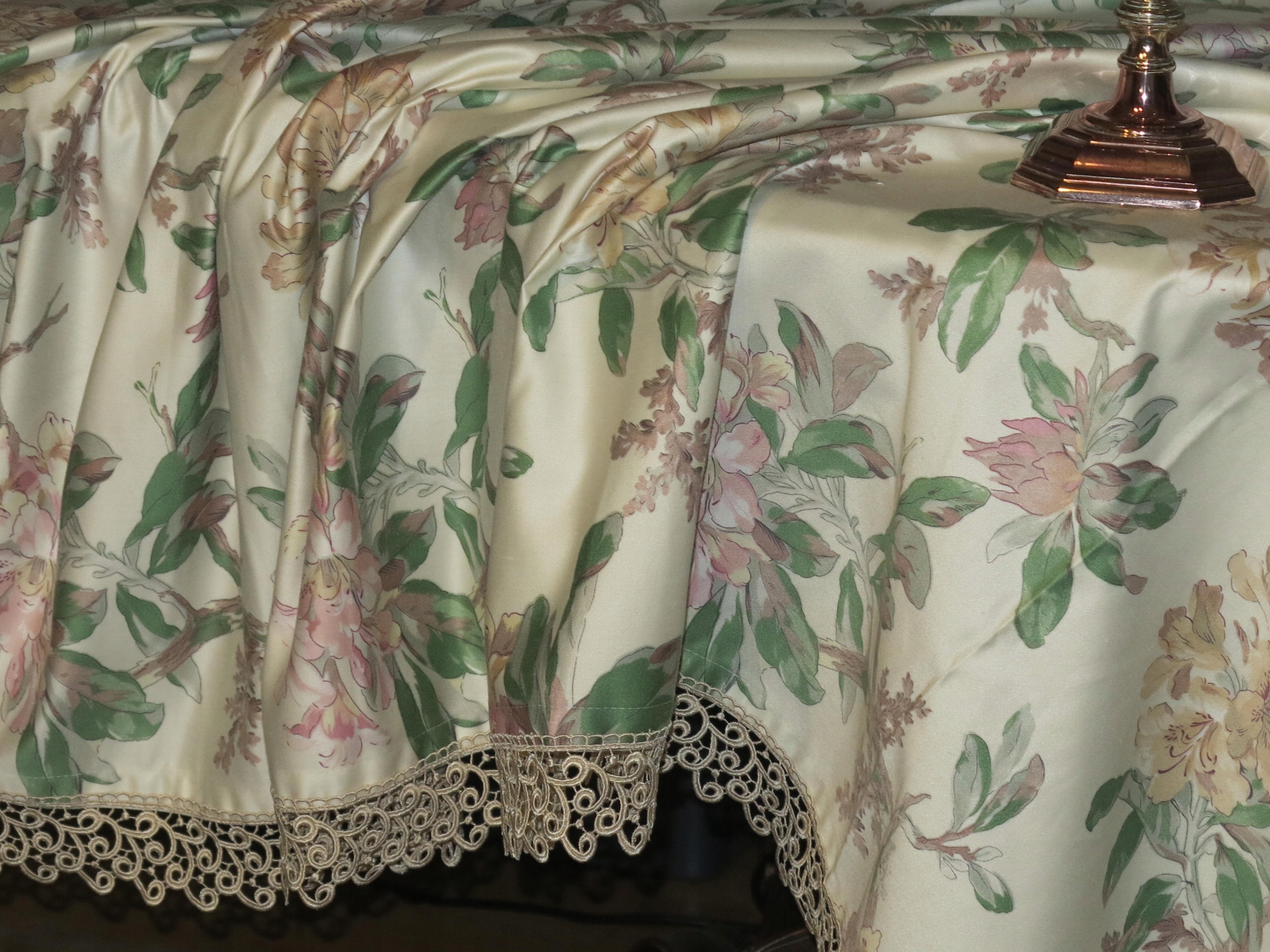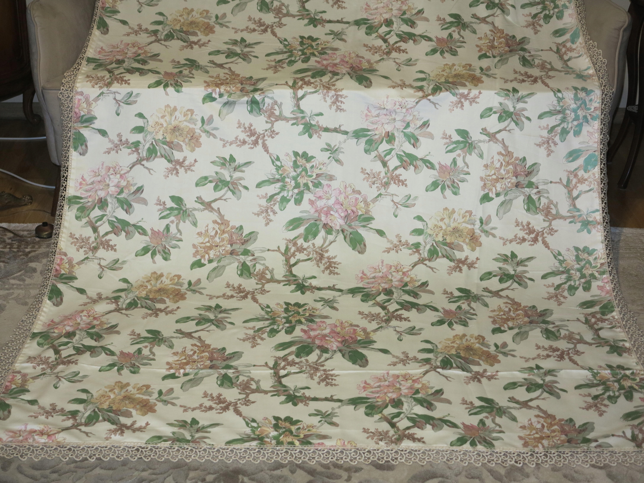 Симпатичная английская огромная скатерть всей ветви цветущей магнолии. Хлопковая атласная скатерть. Приблизительно украшен Guipiur, используется в супер хорошем состоянии. Это выглядит чрезвычайно очаровательно