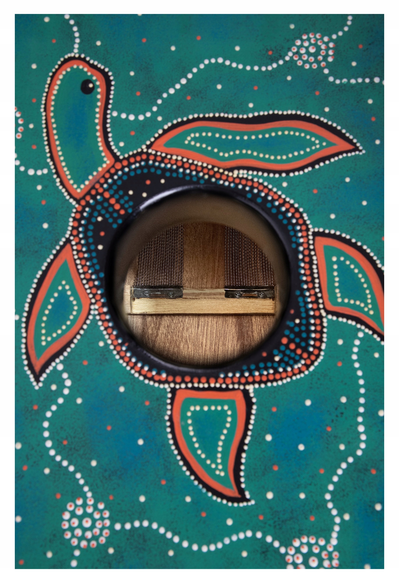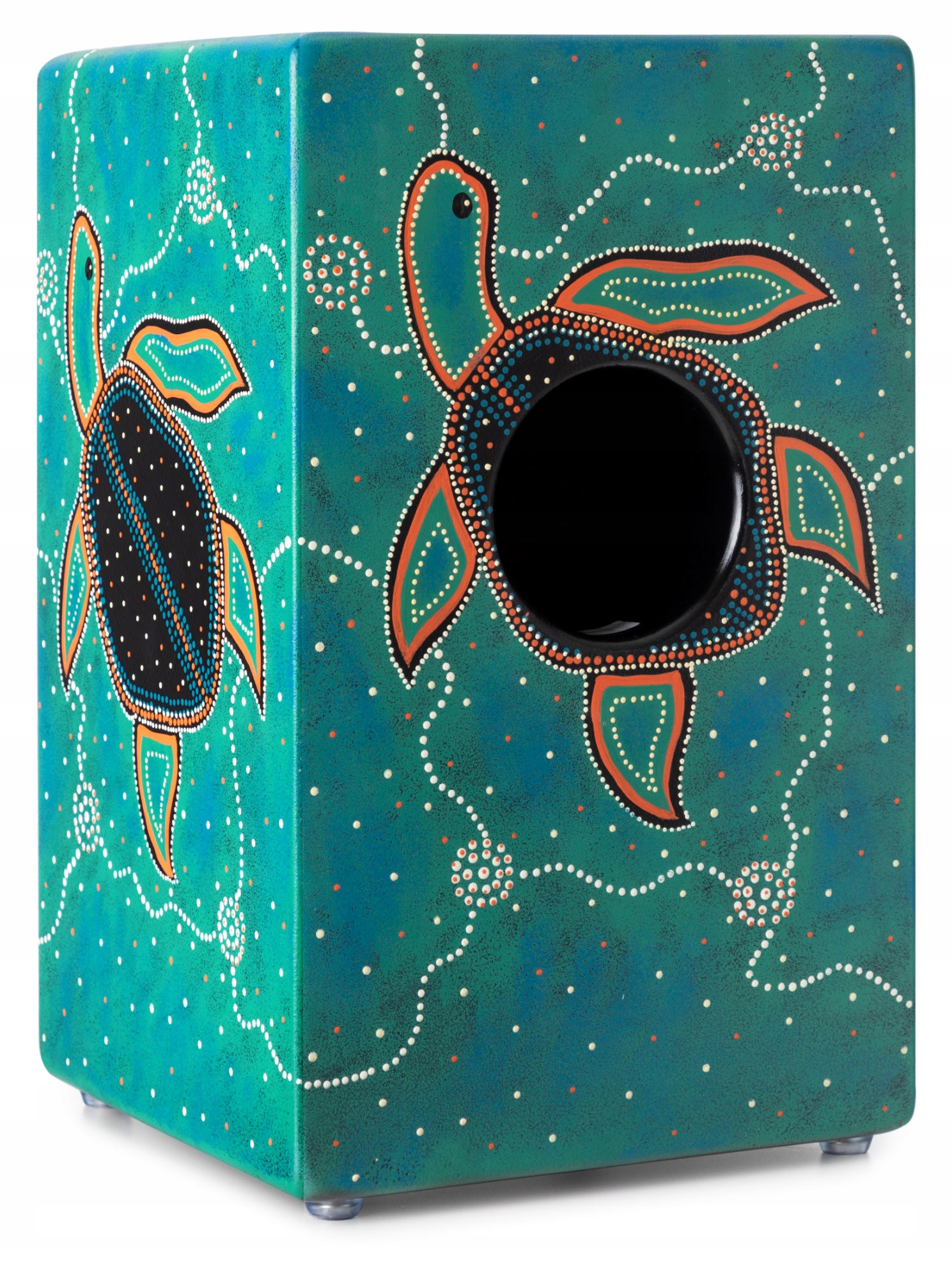 Дизайнерский кахон с принтом в виде черепах в горошек. Встроенный басовый порт, корпус из HPL, верхняя половина передней панели прикручена, стационарный малый барабан, напористый бас.
