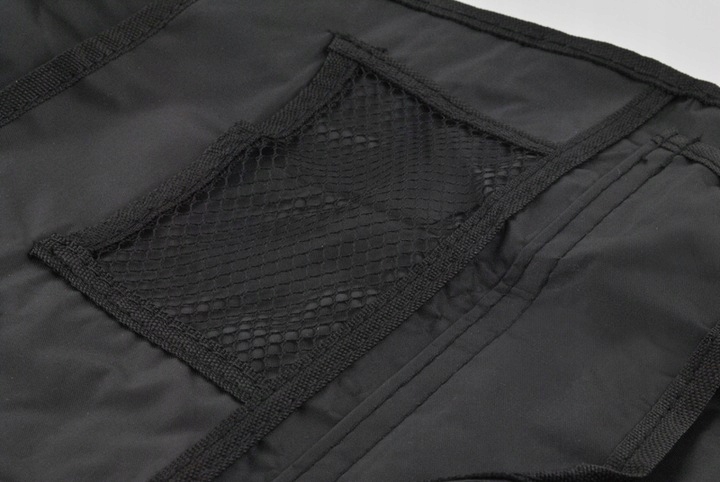 Органайзер надевается без каких-либо усилий — достаточно прикрепить ремни-липучки к подголовнику и прикрепленные шнурки к низу кресла.