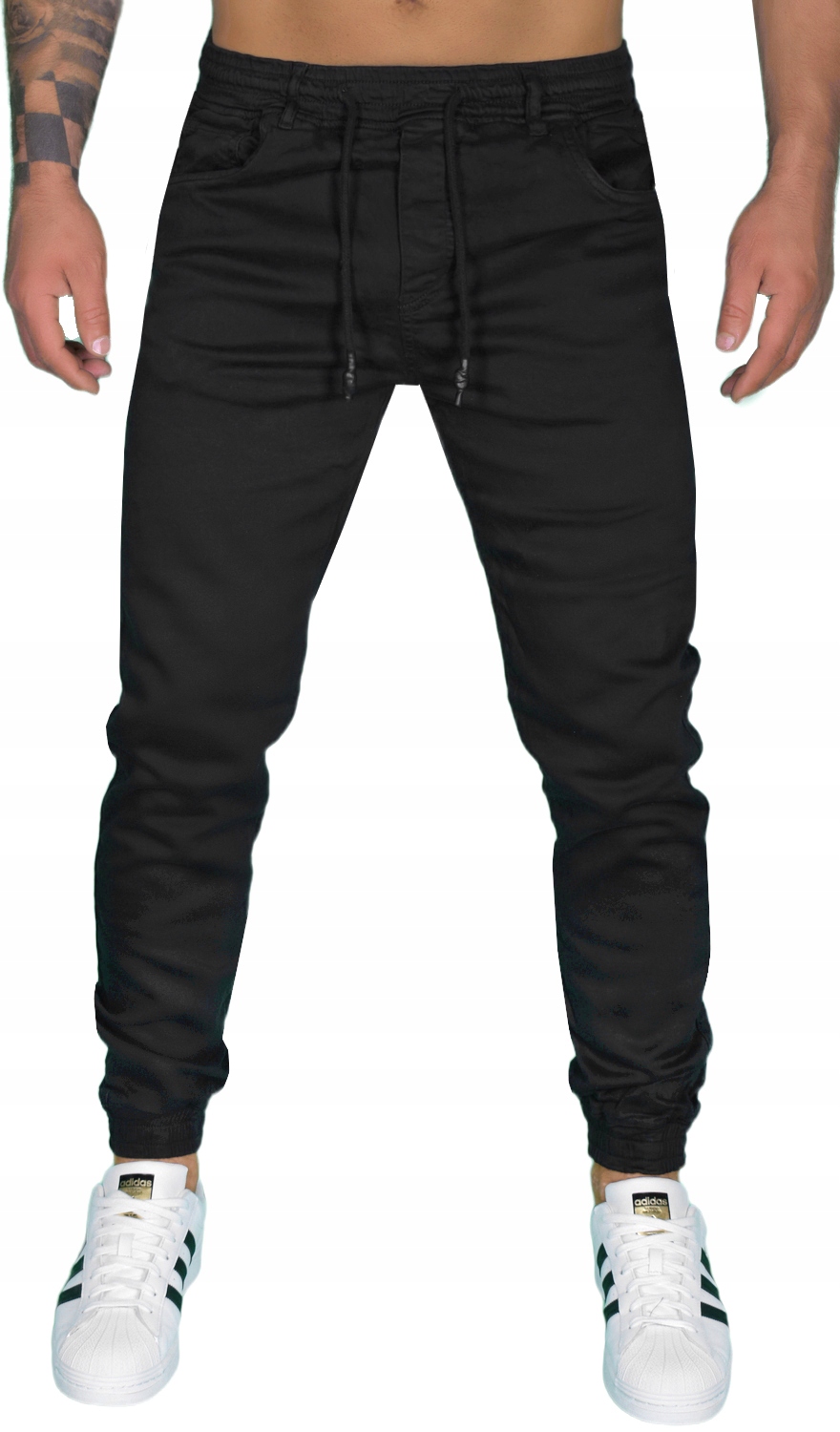 Брюки выполнены из широкой эластичной резины с кулиской для регулировки обхвата.
