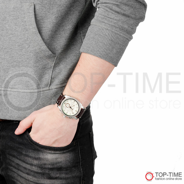 Большие мужские часы Machine вдохновлены индустриальным стилем – цивилизацией. отрасль, которая стремится к техническому совершенству. В массивном корпусе размещен механизм с хронографом и указателем даты. Все дополняет толстый ремень из натуральной кожи с прострочкой.