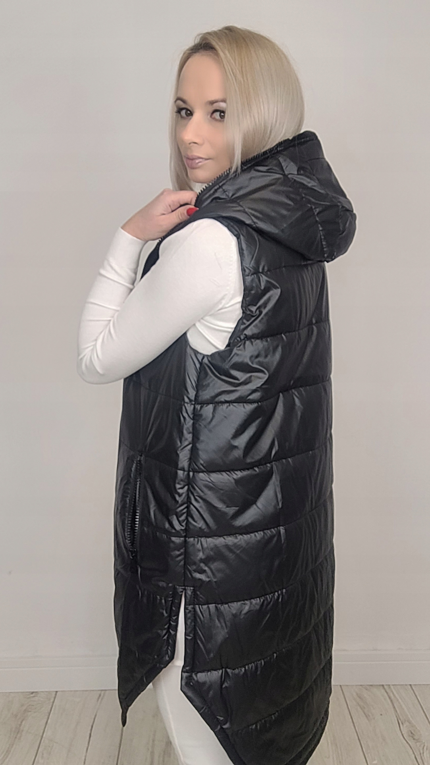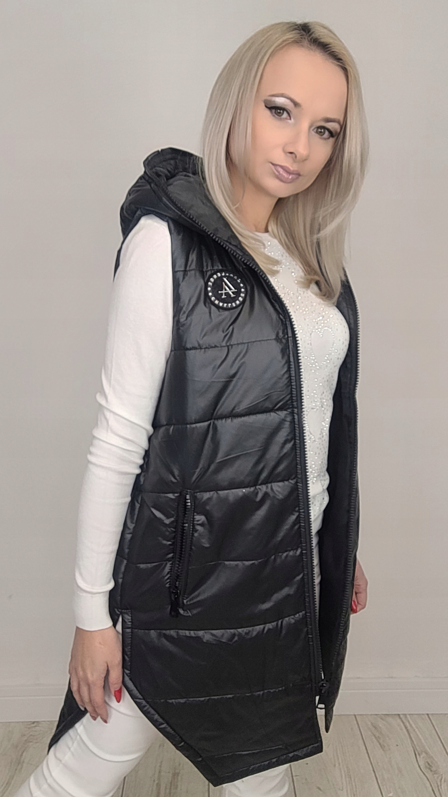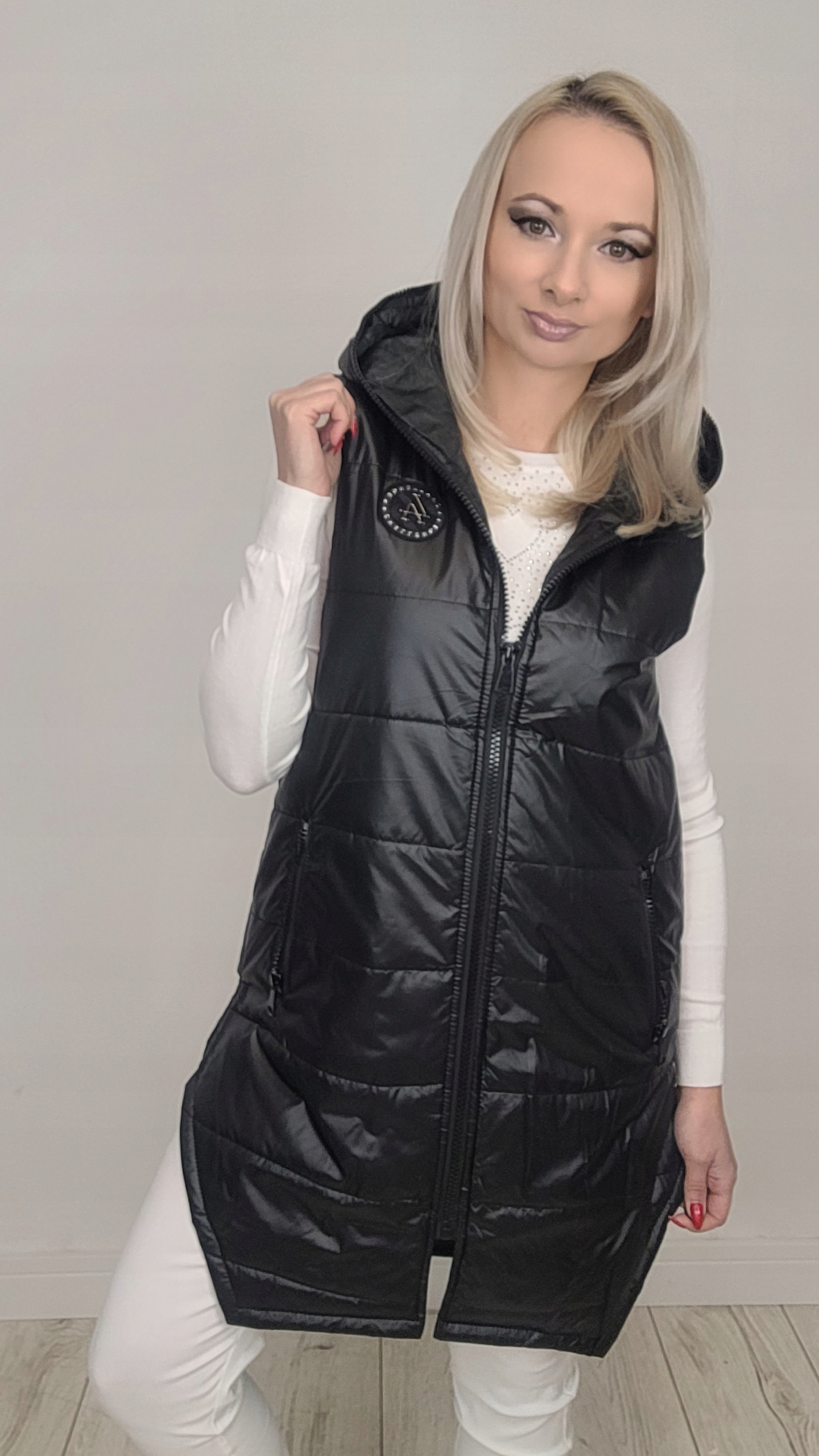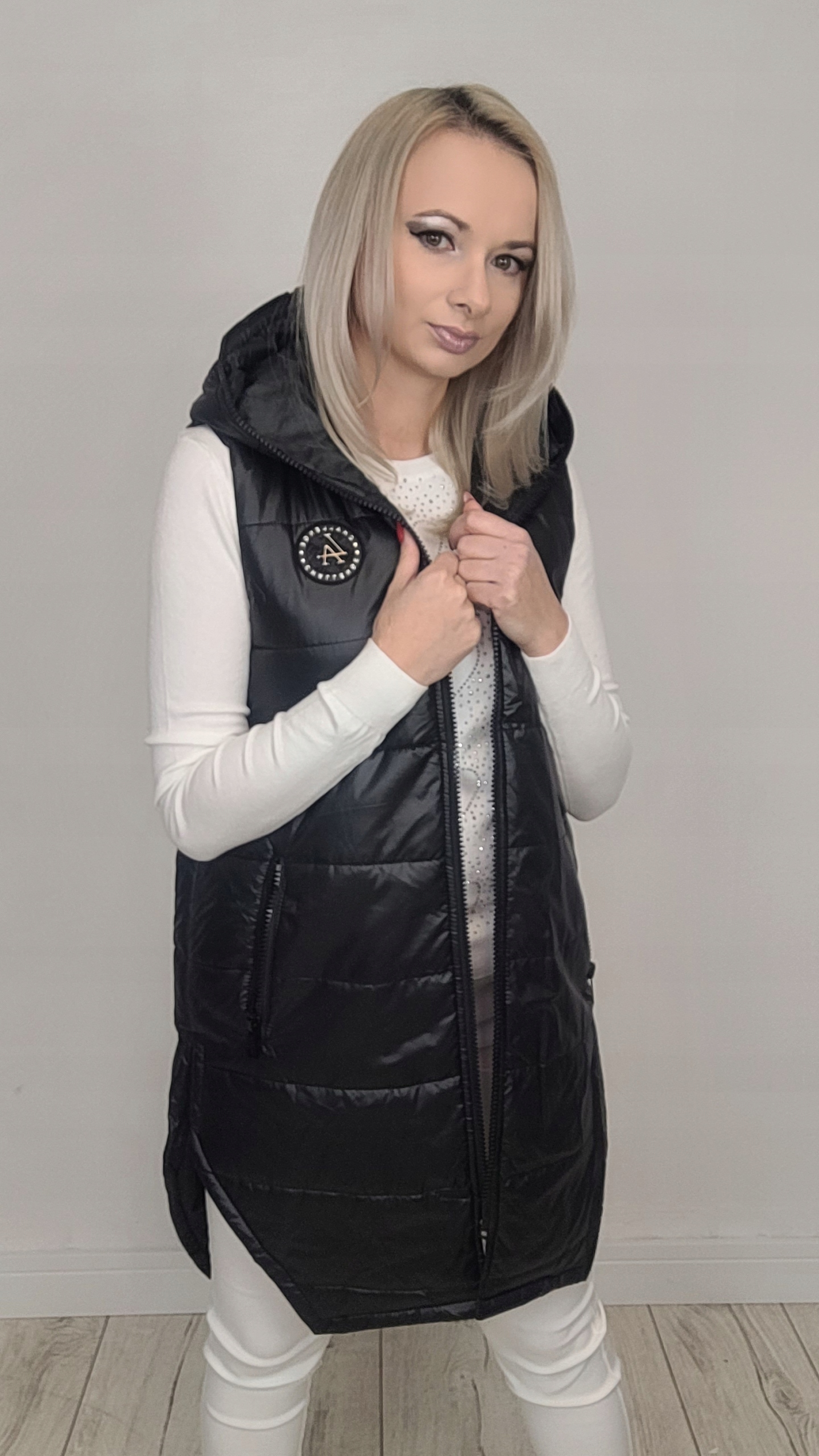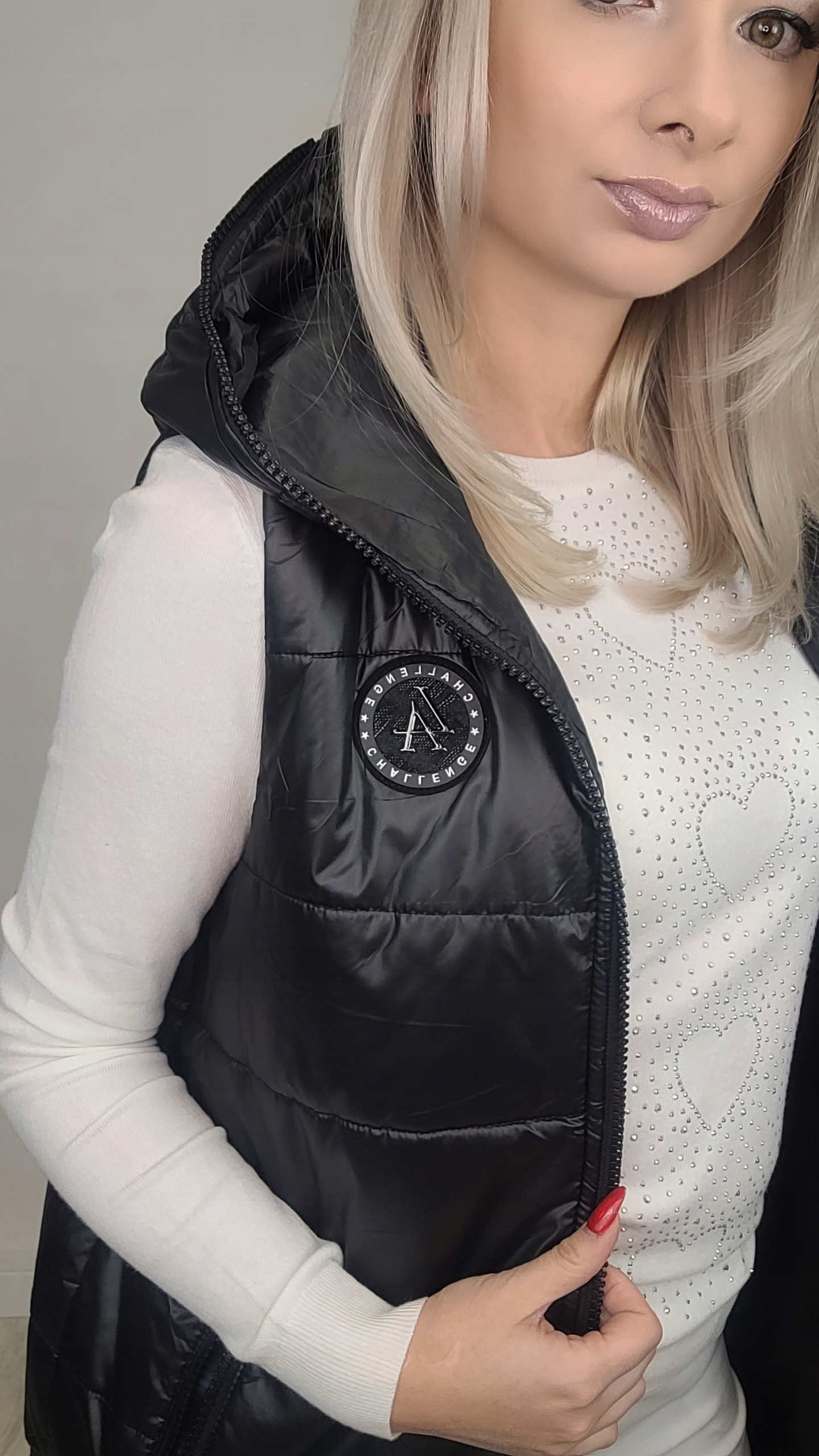 Женский стеганый жилет с капюшоном. Жилет и карманы на молнии. Просторный капюшон защитит от ветра.