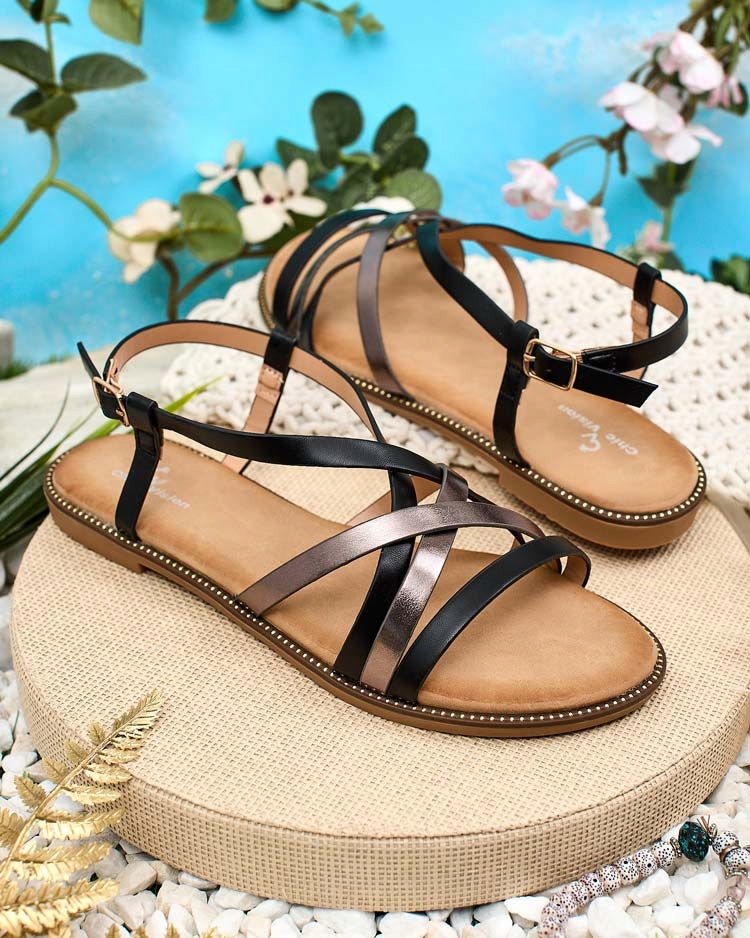 Женские босоножки на плоской подошве - идеальная идея для жарких летних дней. Ремешки выполнены из экокожи, а вставка – из матовой экокожи. Модель украшена декоративными полосками.
