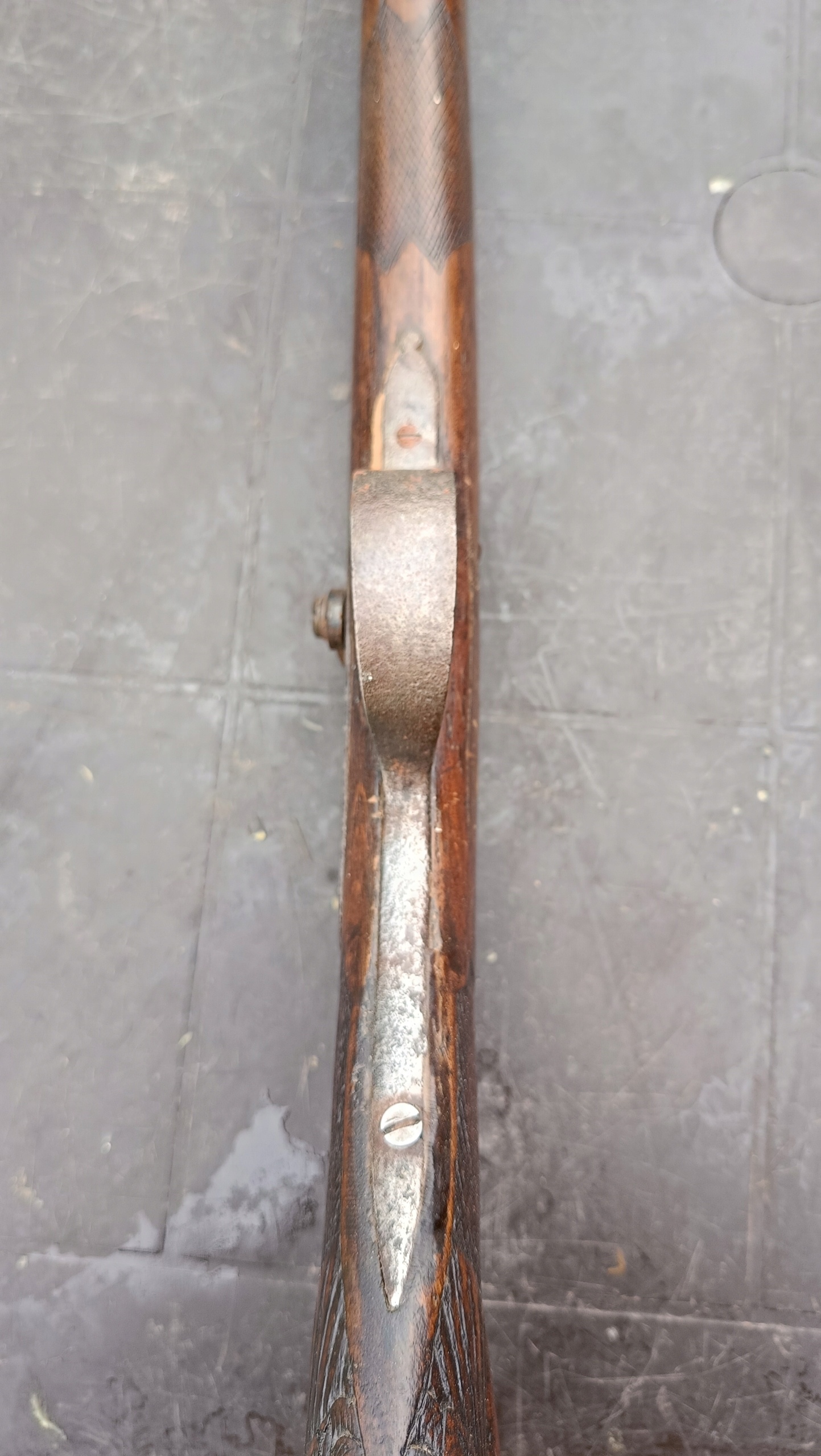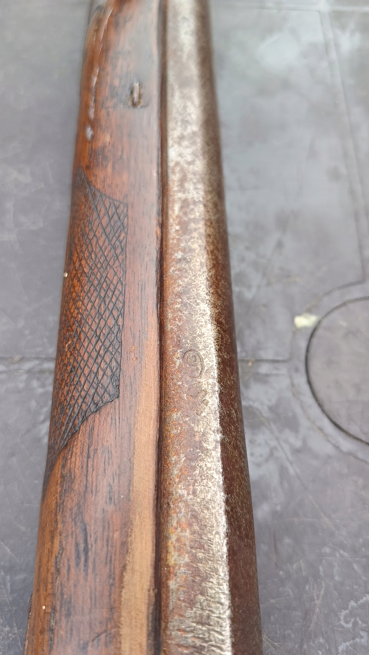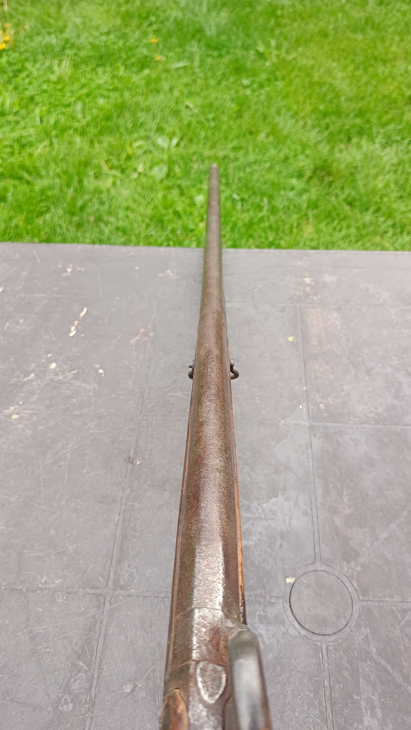 загружен спереди. Вы можете сделать сухой выстрел, двойное напряжение. Замок триггера работает хорошо. Ствол в хорошем состоянии - без галстука -бабочки и маленьких ям. Полем Дерево все еще мало. Общая длина 122,5 баррелей 85,5 см. Обвенчались. Высокие 15,8 мм.