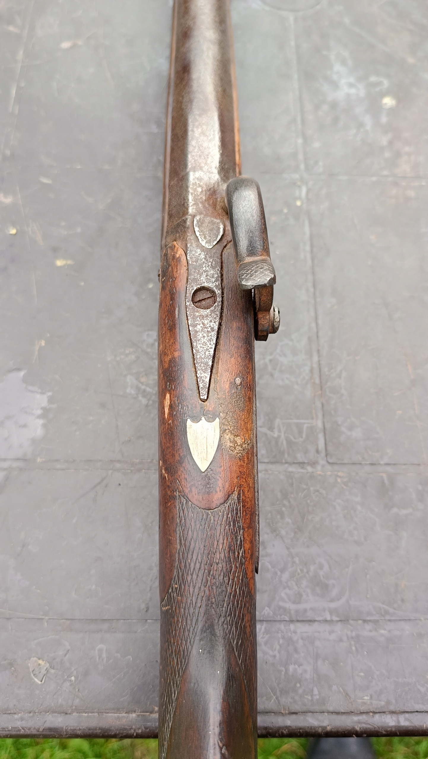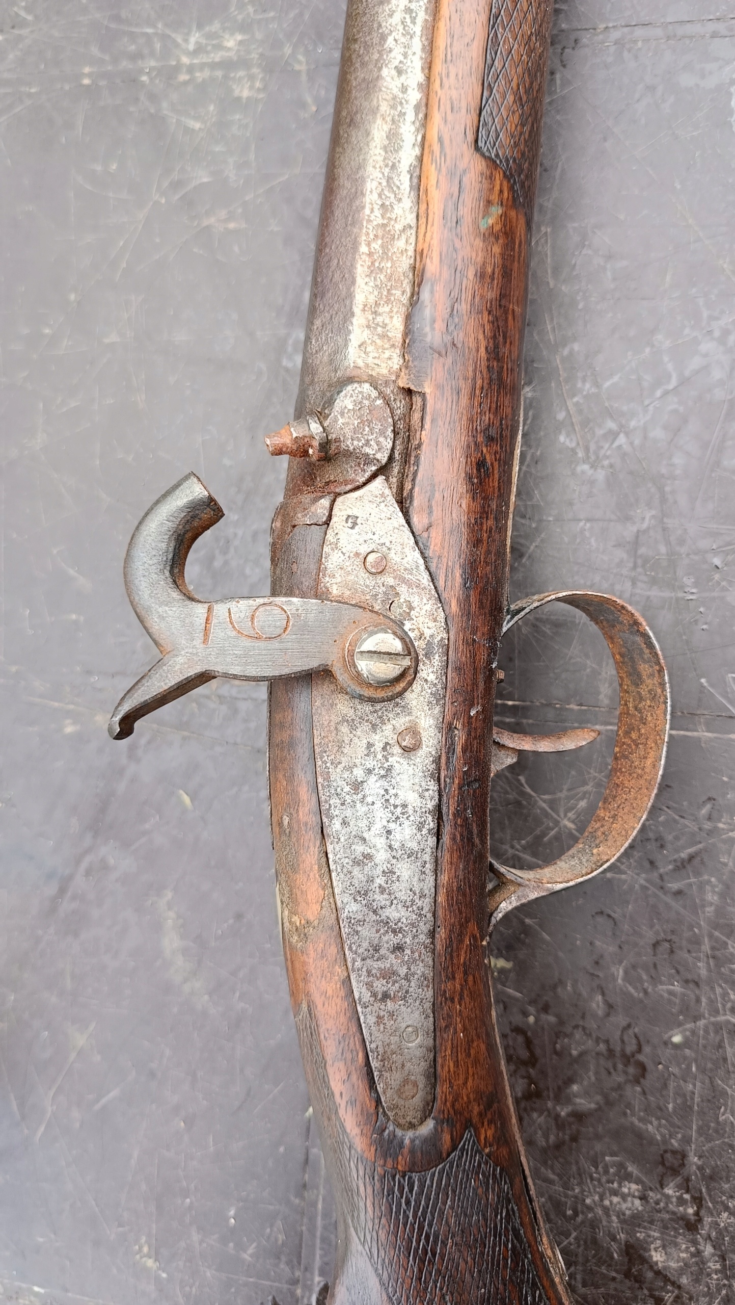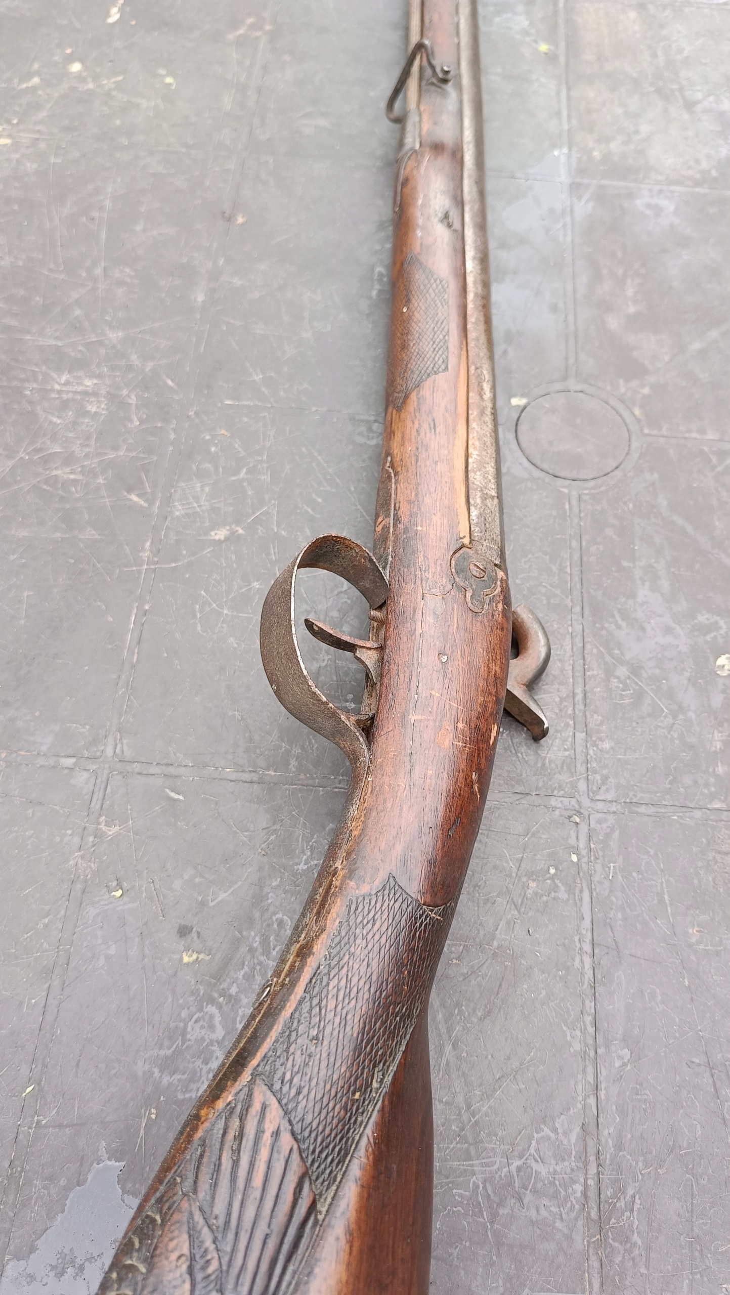 загружен спереди. Вы можете сделать сухой выстрел, двойное напряжение. Замок триггера работает хорошо. Ствол в хорошем состоянии - без галстука -бабочки и маленьких ям. Полем Дерево все еще мало. Общая длина 122,5 баррелей 85,5 см. Обвенчались. Высокие 15,8 мм.