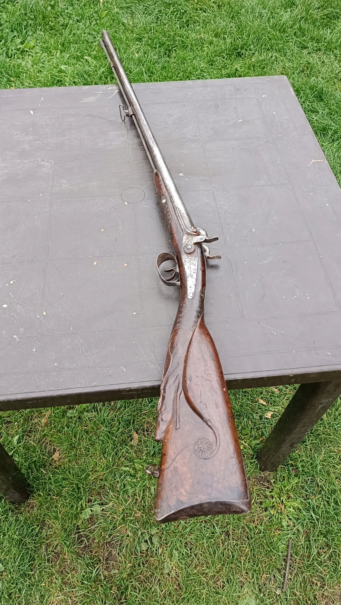 Загружено с фронта. Вы можете сделать сухой выстрел, двойное напряжение. Замок спуска работает хорошо. Простая ствола имеет одну серьезную вмятину (видимую на фото). Все дерево. Камины - один хороший другой уже уже компактный. Бочка не из этой колбы.