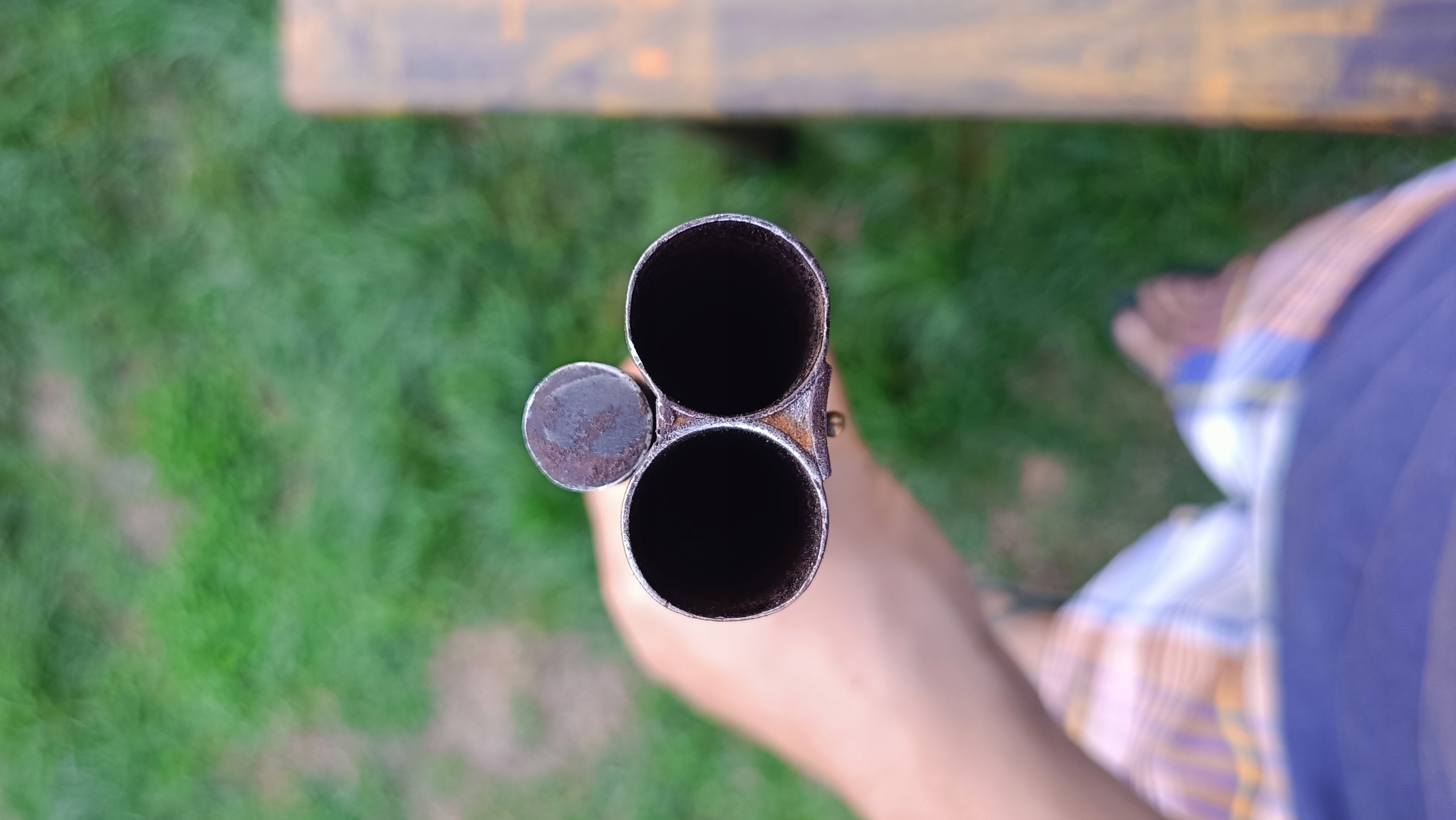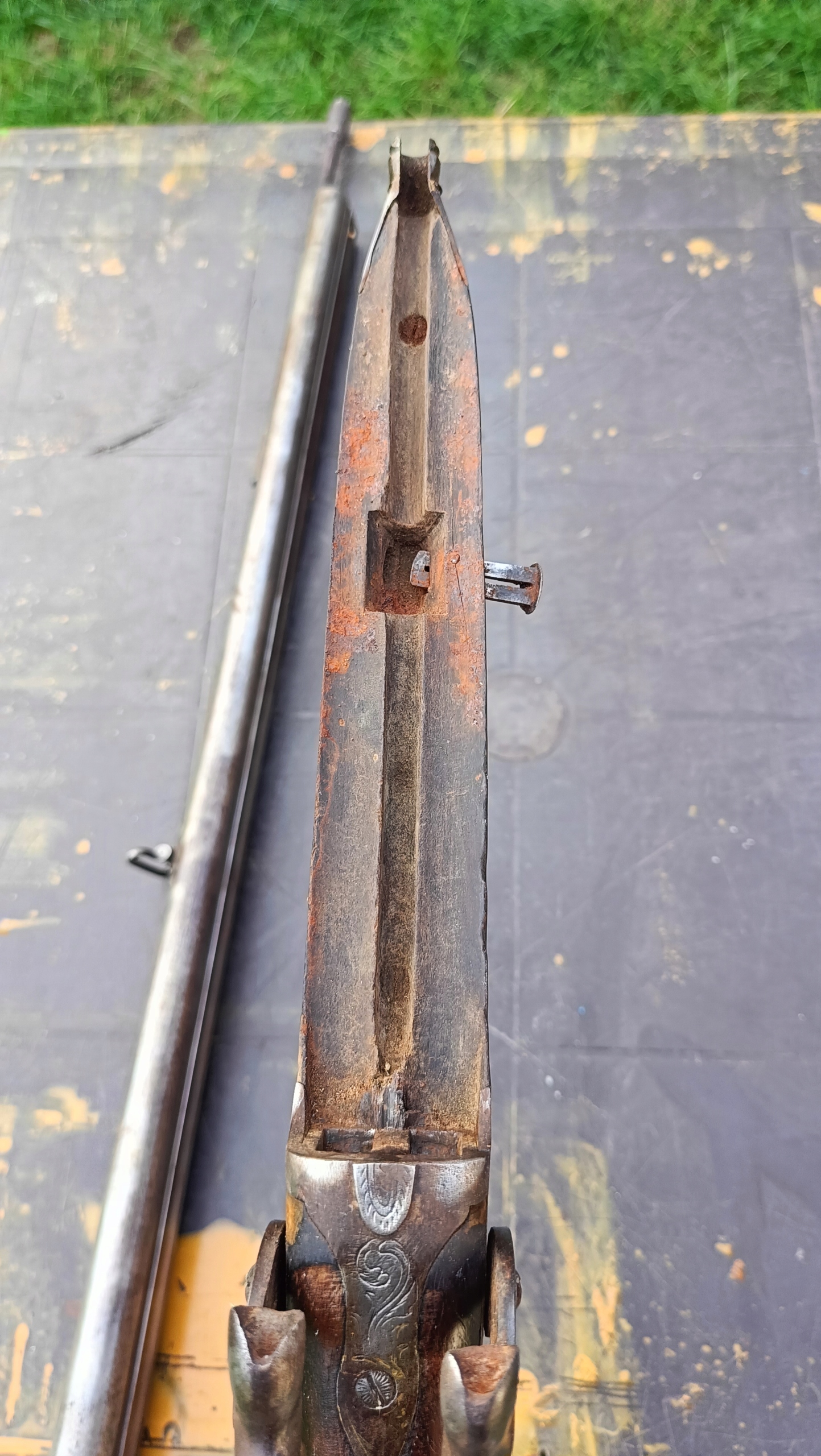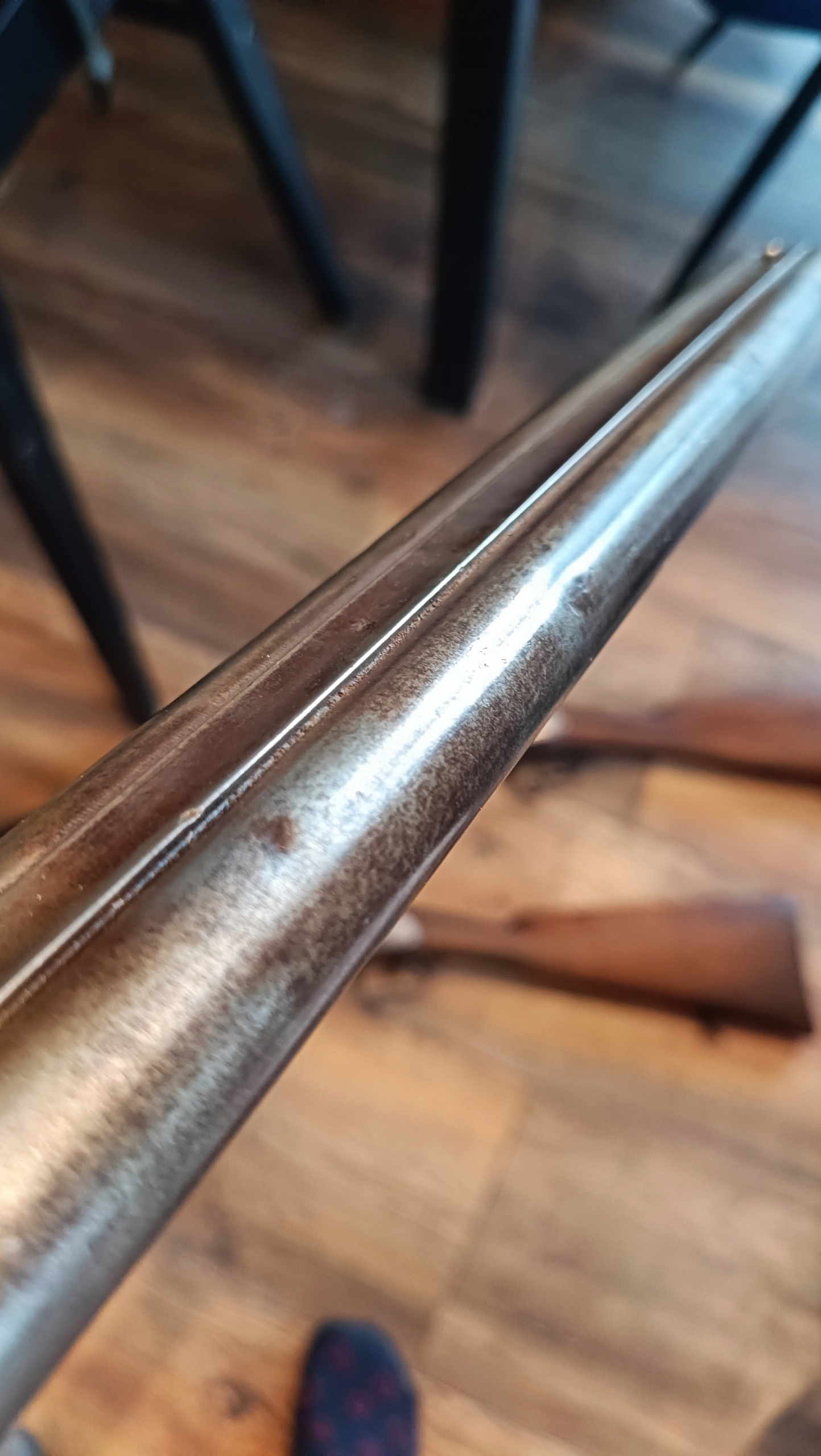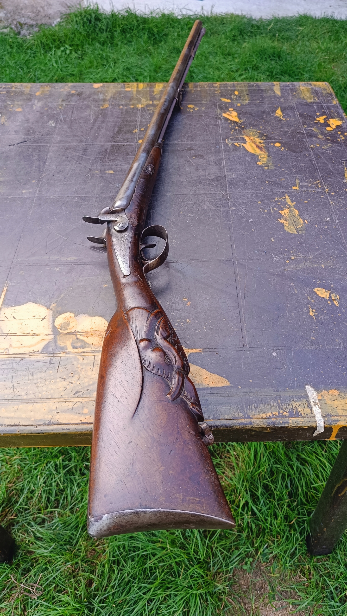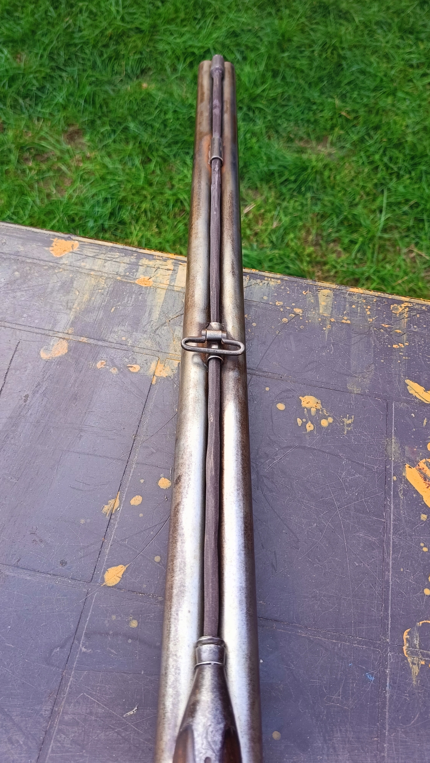 Загружено с фронта. Вы можете сделать сухой выстрел, двойное напряжение. Замок спускового крючка затянуты двумя стержнями. Прямая ствола в хорошем состоянии, два минимальных вмятина в стволе, видимых на последней фотографии. Дерево в хорошем состоянии. Камины в порядке.