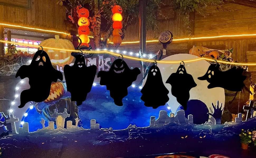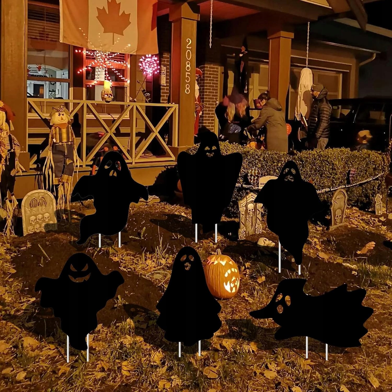 - Высокое качество: сделано из погоды -устойчивый к волнистым черным пластику, 6 кусочков призраков Хэллоуина, размером шириной 30 см, шириной x 40 см. Благодаря тому, что сборка быстрая и легкая. Просто поместите два дюбеля в каждое украшение и нажмите на землю, чтобы отобразить его.
